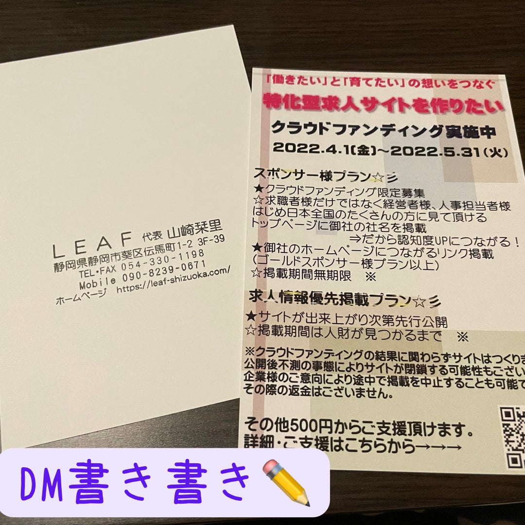 おはようございます、LEAF 代表 山崎栞里です。昨日は静岡駅近郊の企業様にクラウドファンディングのお知らせをポスティングしてきました^ ^ひとりでも多くの支援者様にご支援頂けるよう頑張ります!!