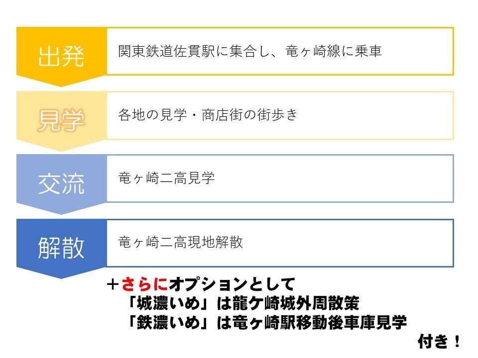 茨城県立竜ヶ崎第二高等学校(以下竜ヶ崎二高と記します)は、龍ケ崎市地域公共交通活性化協議会の活動の一環として、関東鉄道竜ヶ崎線はじめ龍ケ崎市内の公共交通の利用促進のためPR活動を行ってきました。そこで、生徒たちに「竜鉄」として親しまれている関東鉄道竜ヶ崎線と竜ヶ崎二高の建つ「龍ヶ峰」に残る龍ケ崎城跡を結んだ街歩きを行い、地域の活性化を図りたいと考えました。