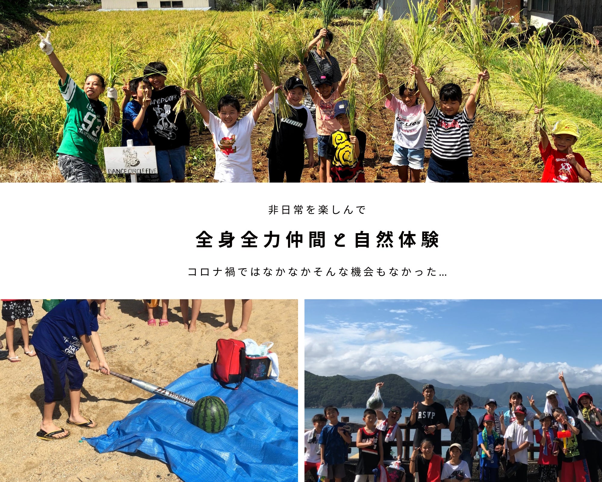 春は田植え!夏は合宿!秋は稲刈りや芋掘り!冬はお楽しみ会など。