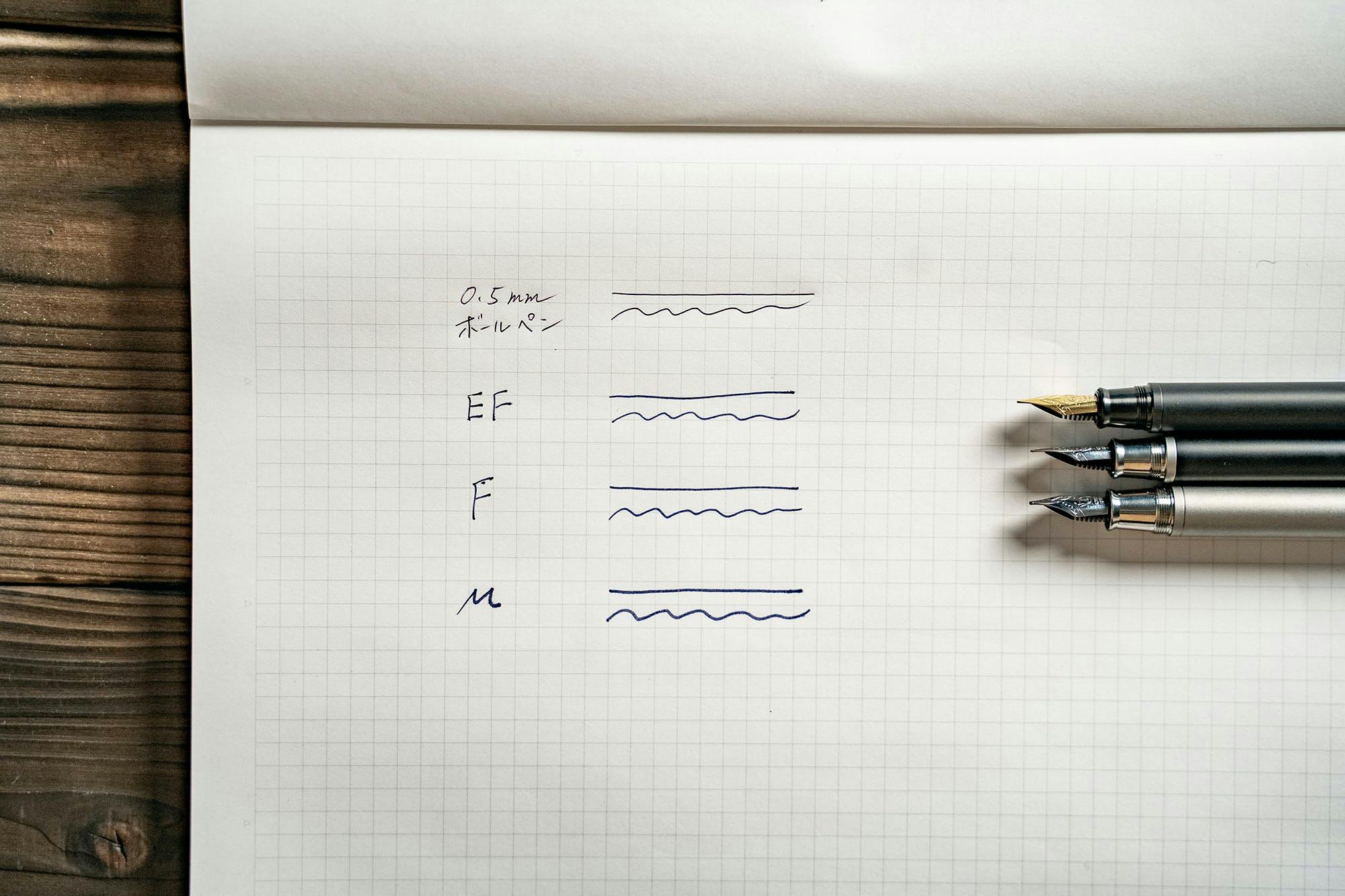 EFは細い分インクフローのコントロールがしやすく、手帳やノートなどで小さな字を書く際に向いています。スタンダードで使いやすい太さのFは普段使いに。手紙などで大きめな字を書く際には、万年筆らしいインクの濃淡を楽しむことのできるMがおすすめです。