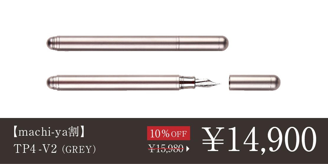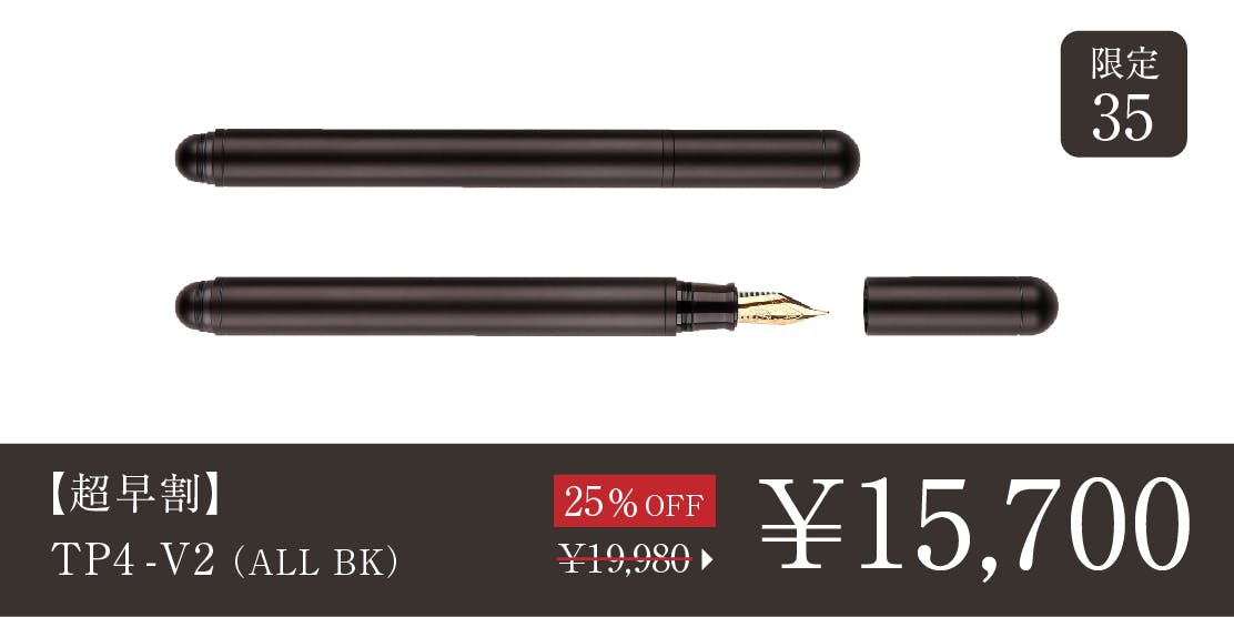 2024/09/04 17:28\TP4シリーズに新モデルが登場/TP4-V2をご支援の皆様皆さまにご支援いただいたTimazeから、新プロダクトTP4-miniが登場しています。TP4シリーズの新モデルとなる、ミニ万年筆です。https://camp-fire.jp/projects/787915/view皆様には改めてのご紹介になりますが、「TP4」シリーズは、シンプルでミニマルな万年筆。手入れをすれば長く使える万年筆を、耐久性もあり腐食にも強い航空機グレードのチタンで作ることで一生モノと呼べる品質に仕上げています。今回の「TP4-mini」は、人気の「TP4-V2」をさらにコンパクトにしたミニバージョンです。ぜひチェックください。TP4-V2の価格据え置きセールについて ※黒ニブを搭載した、ALLブラックモデルも追加されています。価格据え置きで長らく販売してきた「TP4-V2」に関しては、輸入コストの上昇を受け、8月21日を以て値上げに踏み切りましたが、TP4-miniの登場に伴いキャンペーン中。オンラインストアで旧価格の値段のままお買い求めいただけるセール販売(予約注文・9月30日まで)を行っていますので、そちらもぜひチェックしてみてください!https://www.microfactory.jp/products/tp4v2>>オンラインストアもぜひチェックください もっと見る