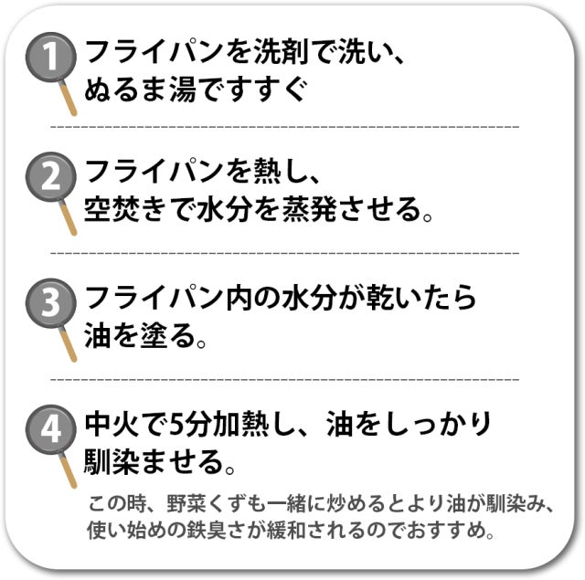 この時、野菜くずも一緒に炒めるとより油が馴染み、使い始めの鉄臭さが緩和されます。