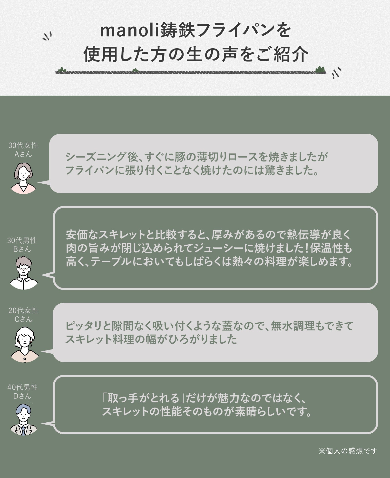 manoliは開発から長い時間を経て、みなさまにお届けする準備が出来ました。manoliは料理の技術革新であるだけでなく、趣味や健康的な料理を行う際の新しい鋳鉄フライパンです。家族や友人達の健康や楽しい日々のためにmanoli鋳鉄フライパンをお使い頂ける事を願っています。