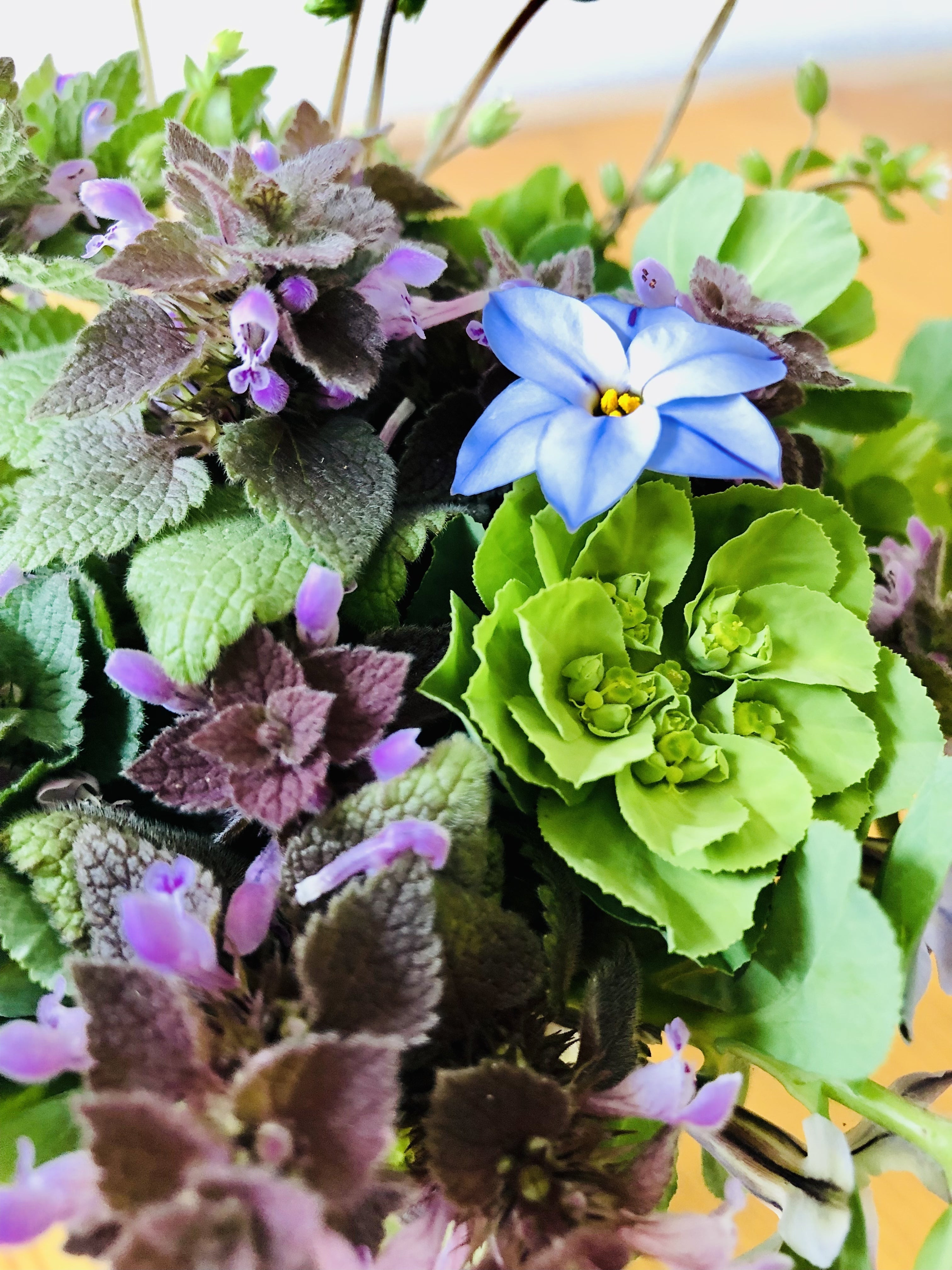 うららかで、あたたかい日でした。地面には、いつの間にか春を知らせる野花がたくさん咲いていました。つい嬉しくて、テーブルフラワーをワイルドブーケで作ってみました。筍はまだのようですが、来月、春の旬を収穫しに来て下さいね。