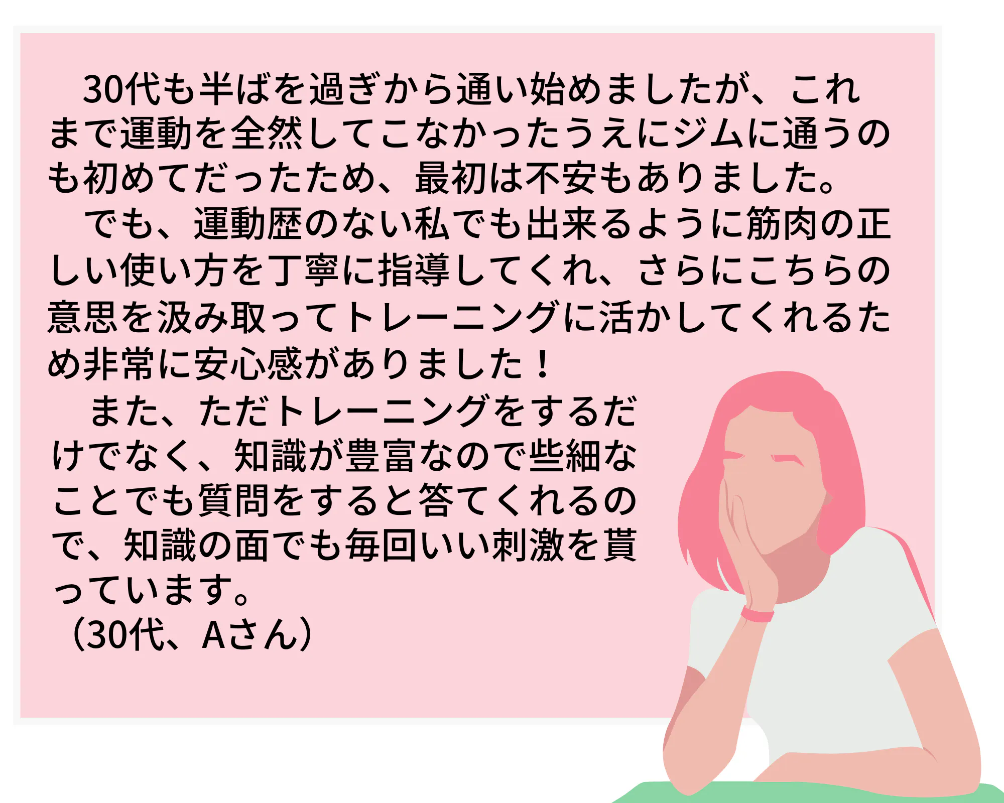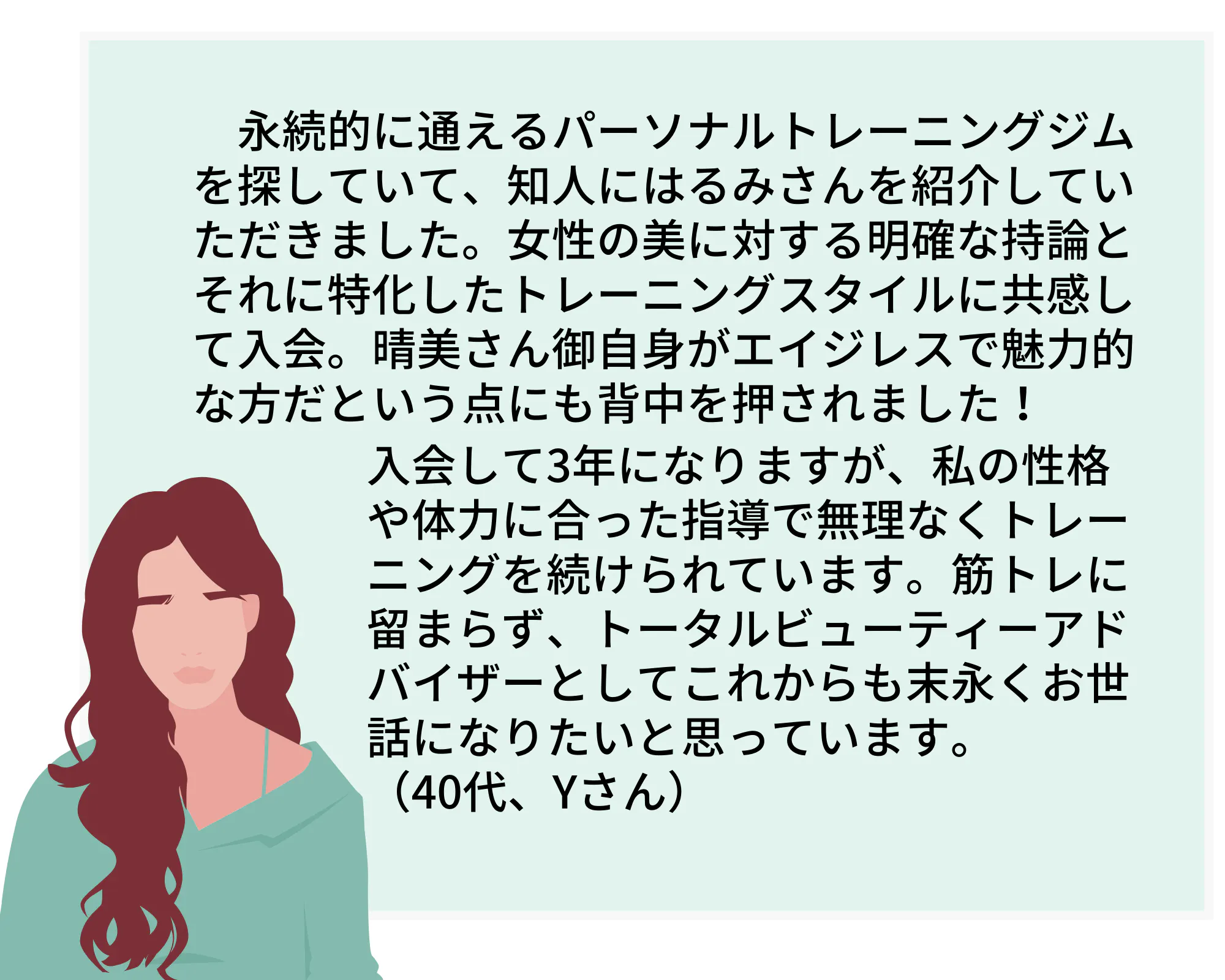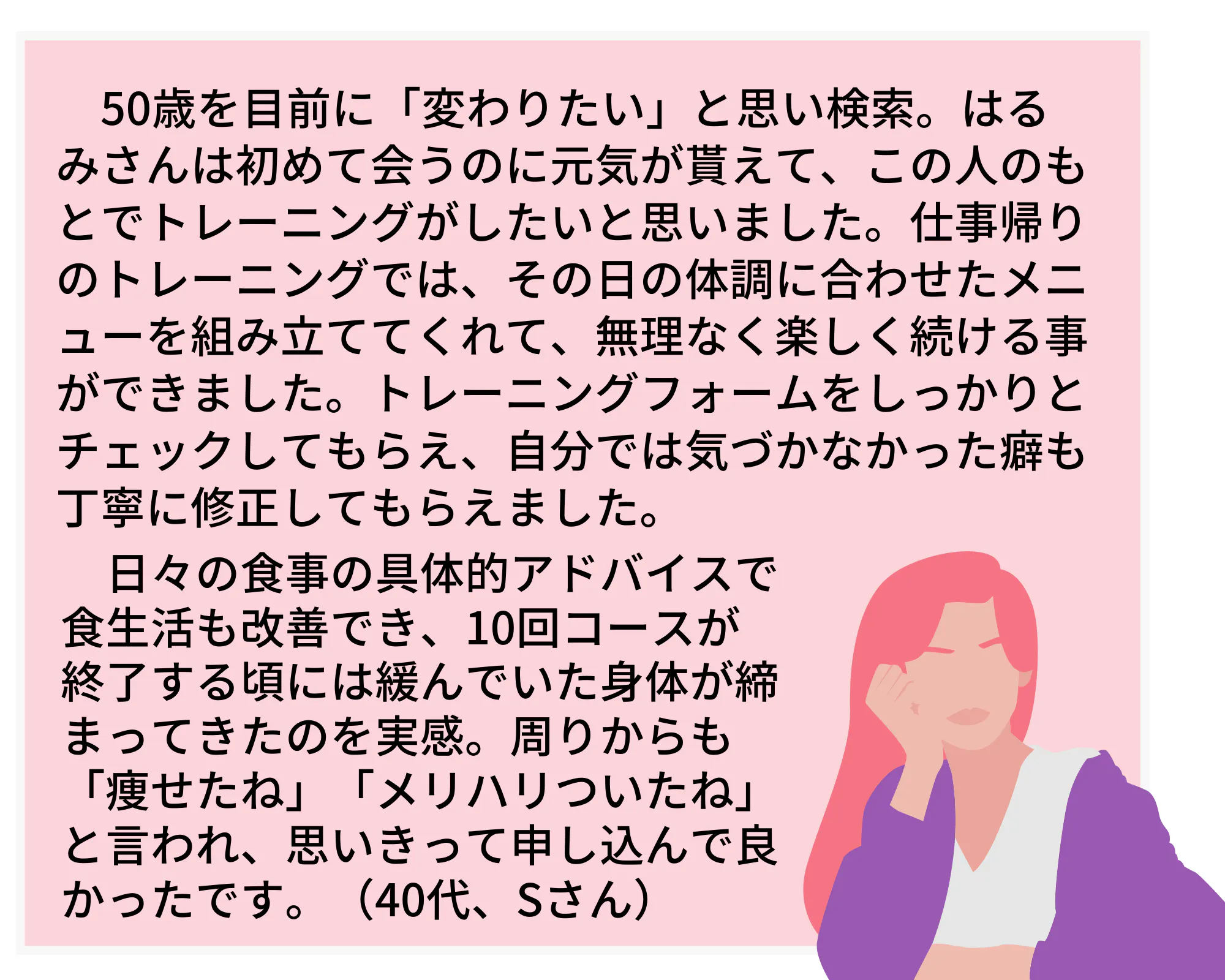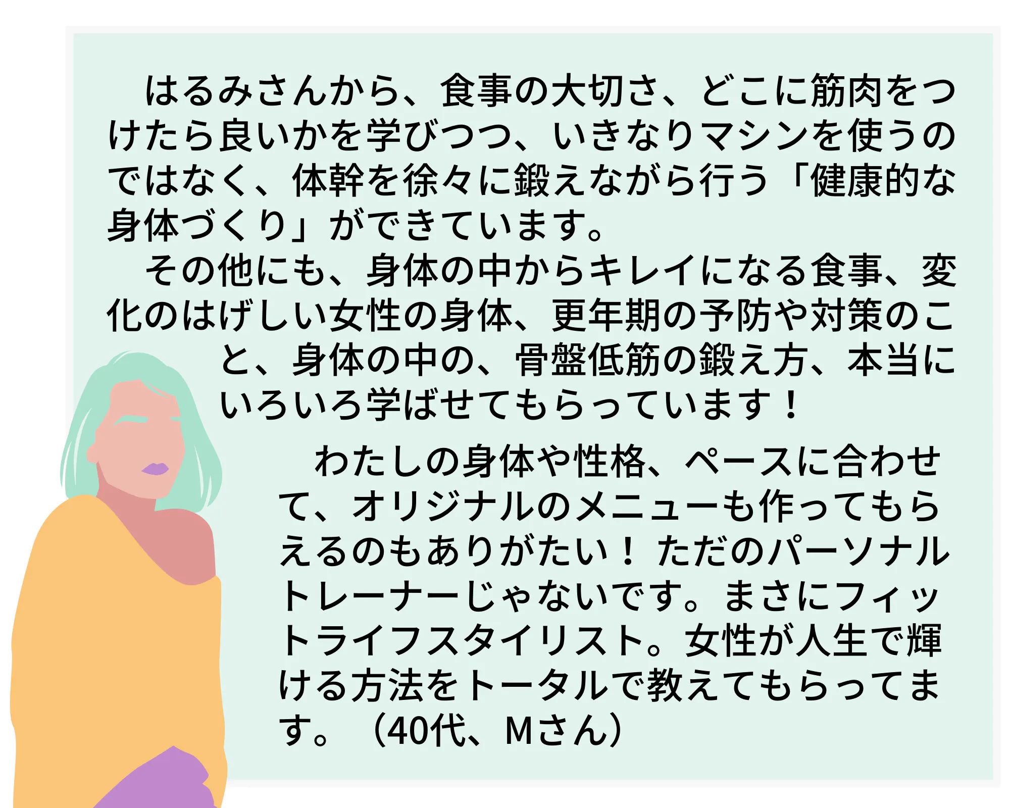 パーソナルトレーニングやその他のプログラムを通して、これまでも多くの女性が自信を取り戻し、美しく、健康に生きるお手伝いができたと自負しています。