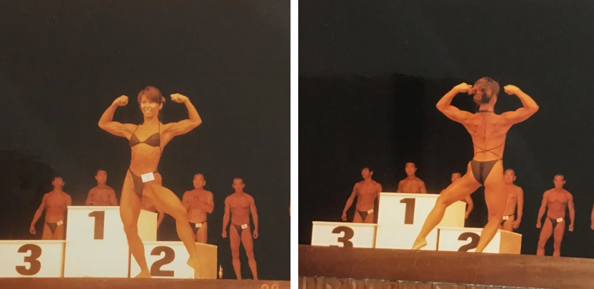 そして、友人に誘われて今度はボディビル競技に挑戦します。ボディビルを初めて経験した頃は、食事の我慢とハードなトレーニングで、美しい体ではありませんでした(上記写真の頃です) 。