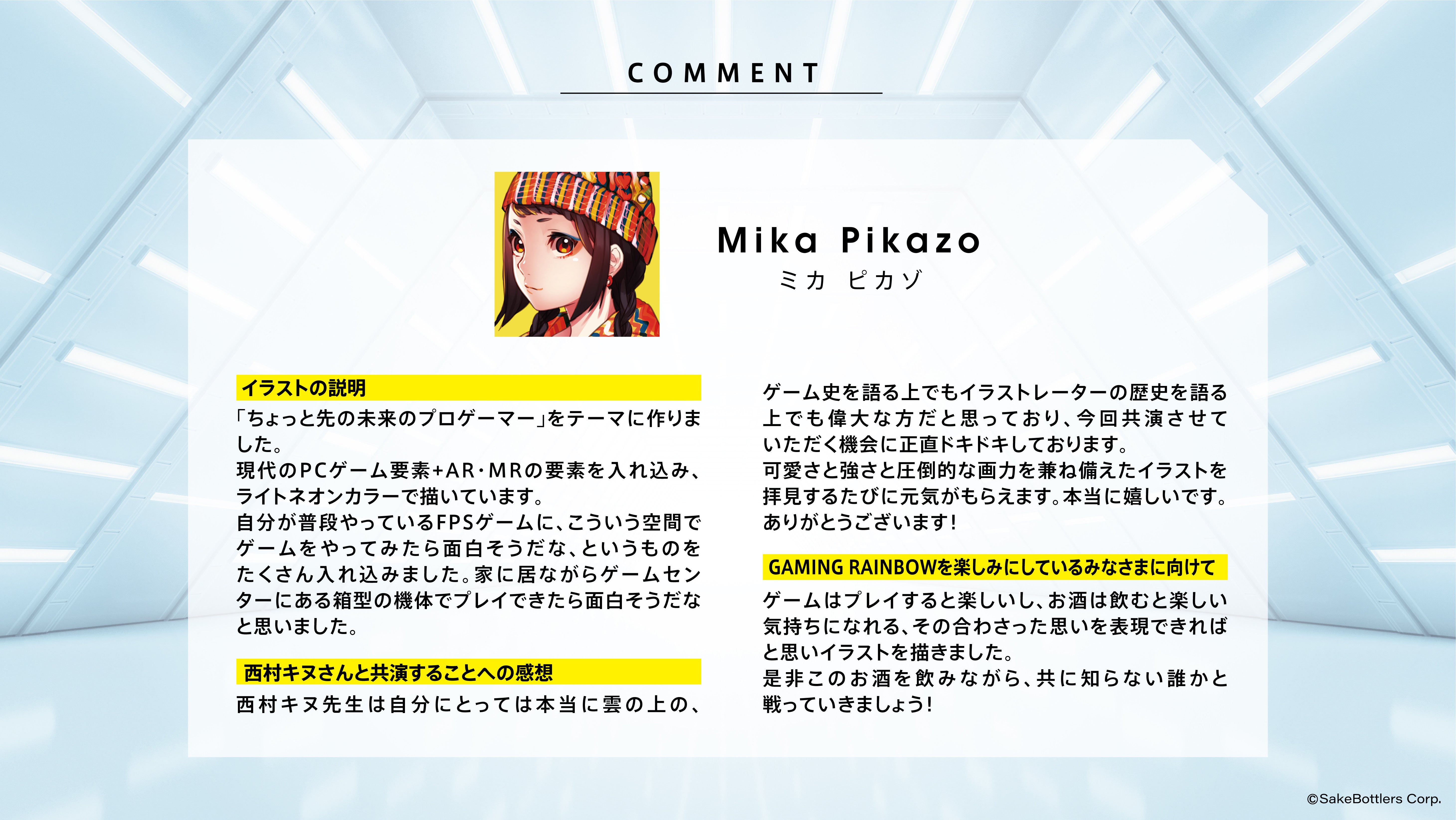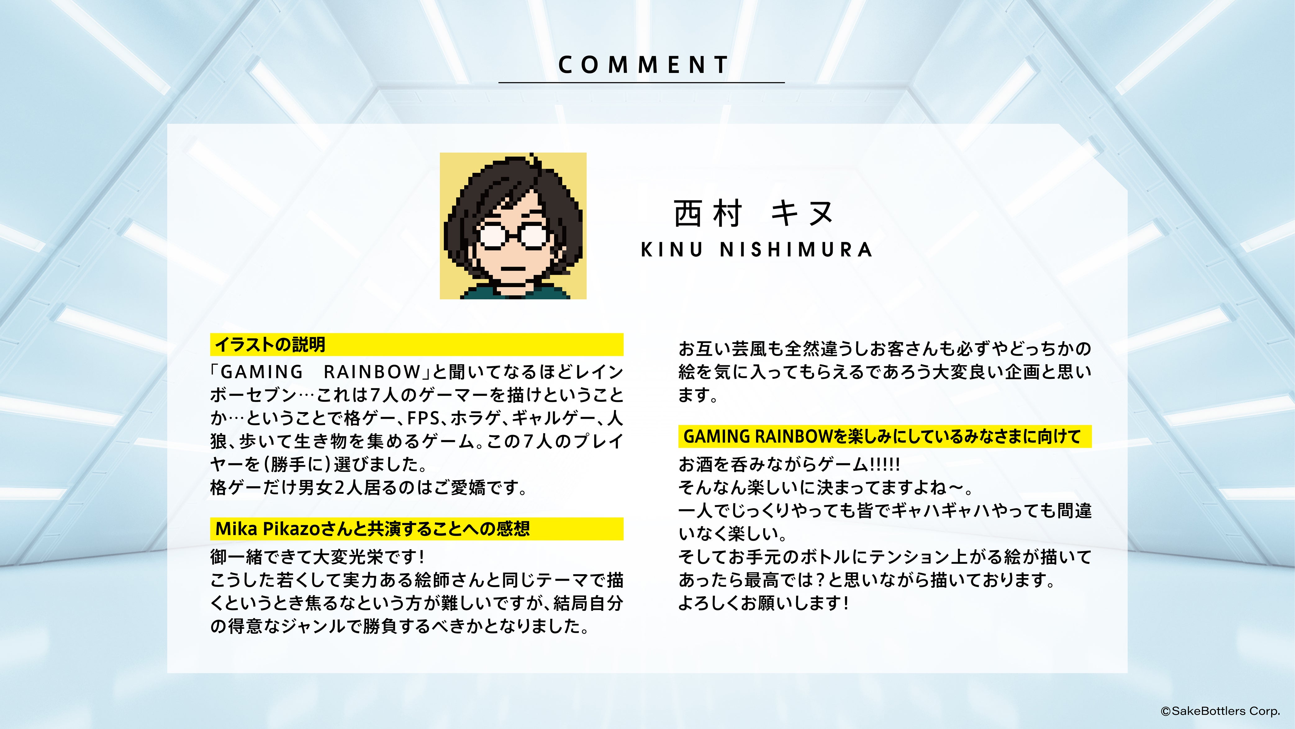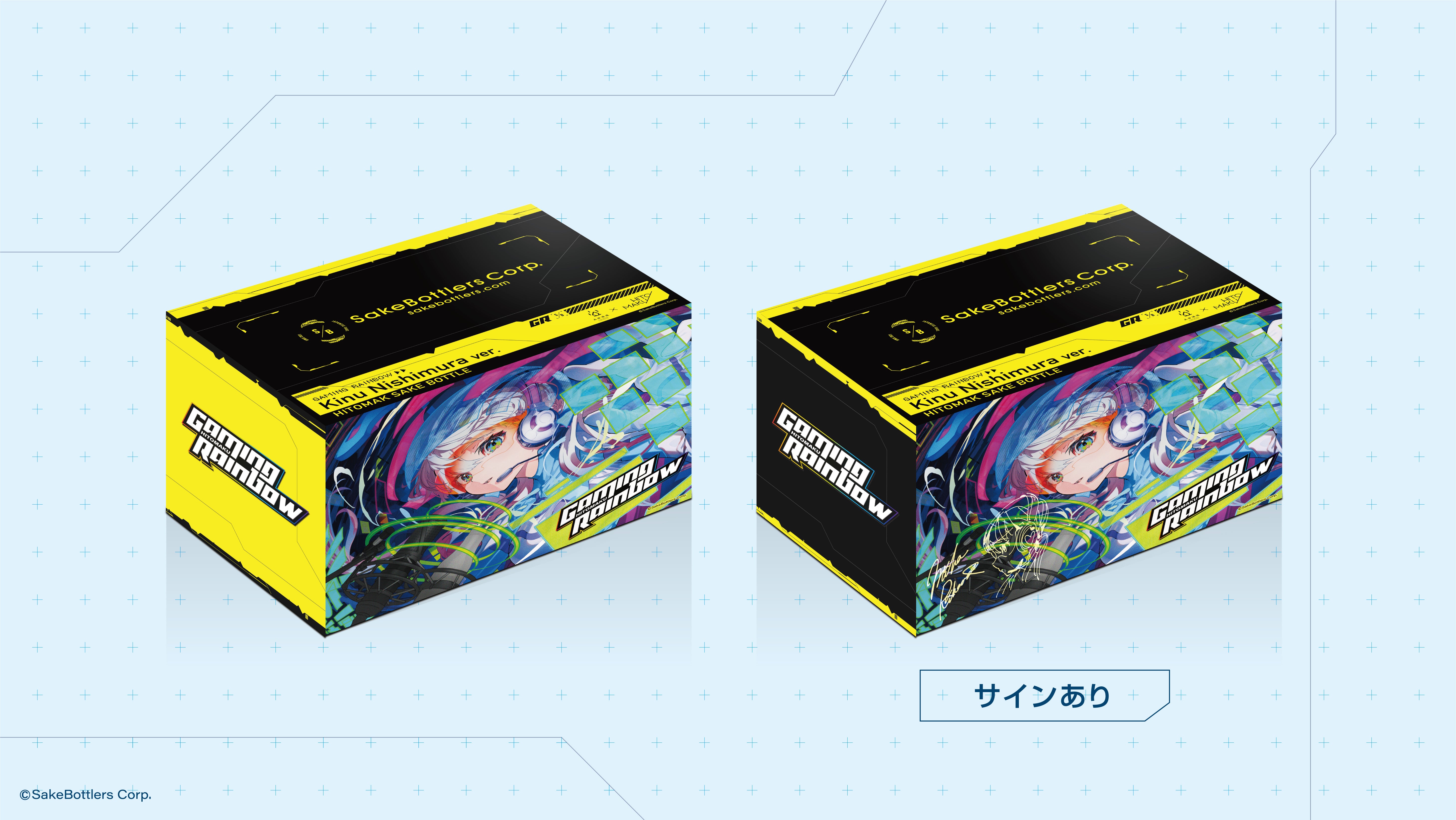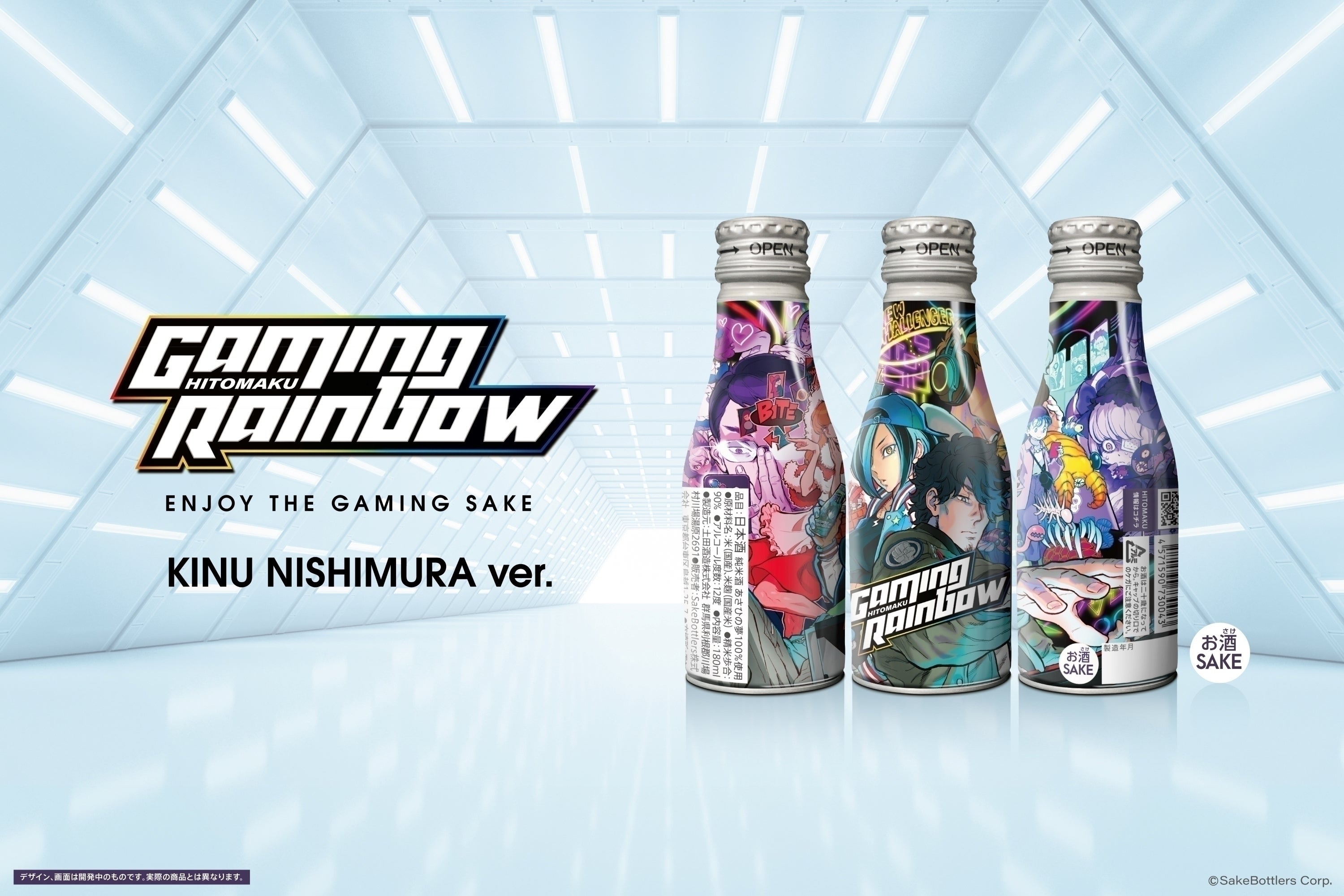イラストレーターに『西村キヌ』、『Mika Pikazo』を起用し、「ゲーム/レインボー/日本酒」というテーマでのイラストで2種類の日本酒ボトル缶を作成しました。