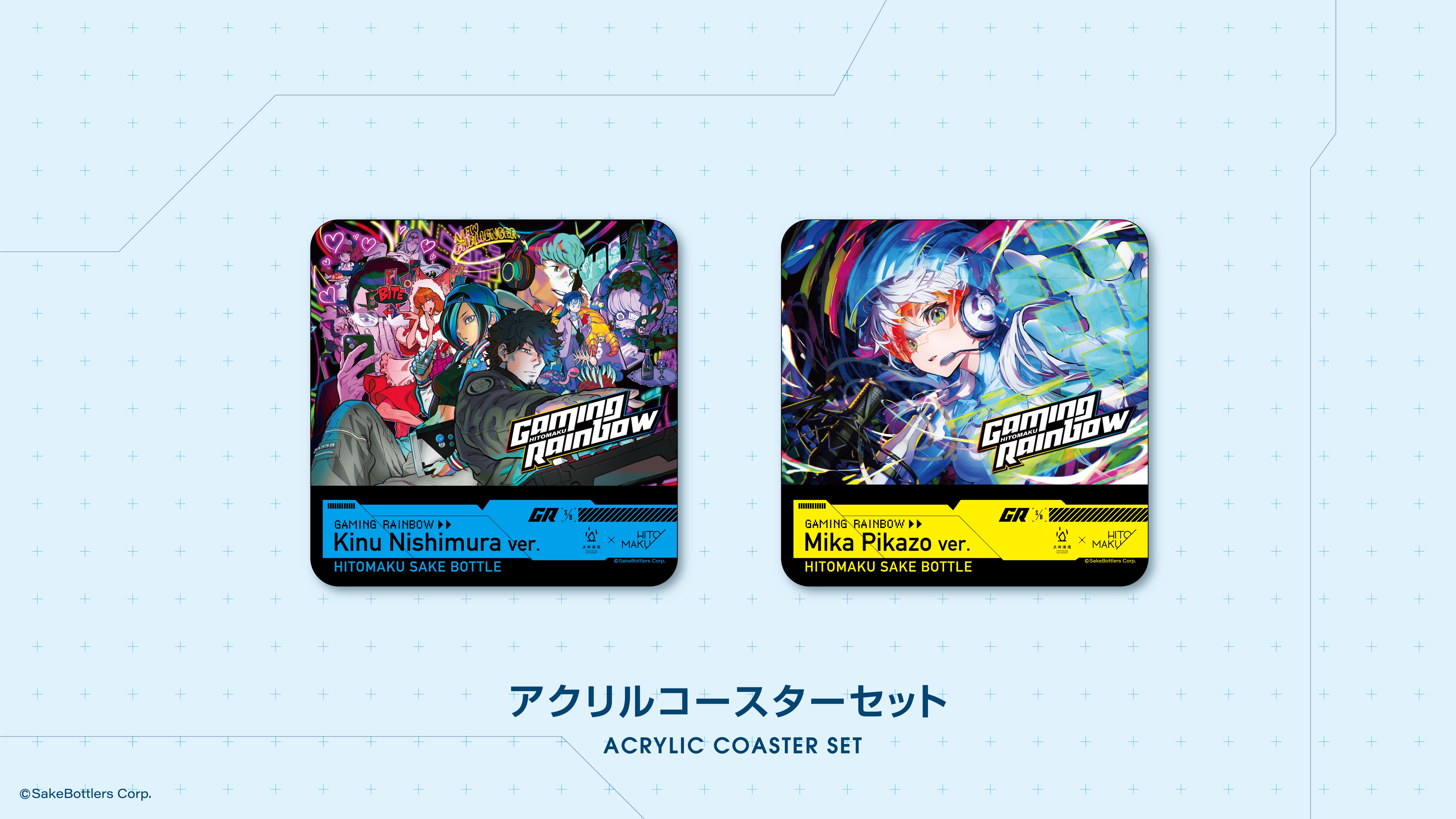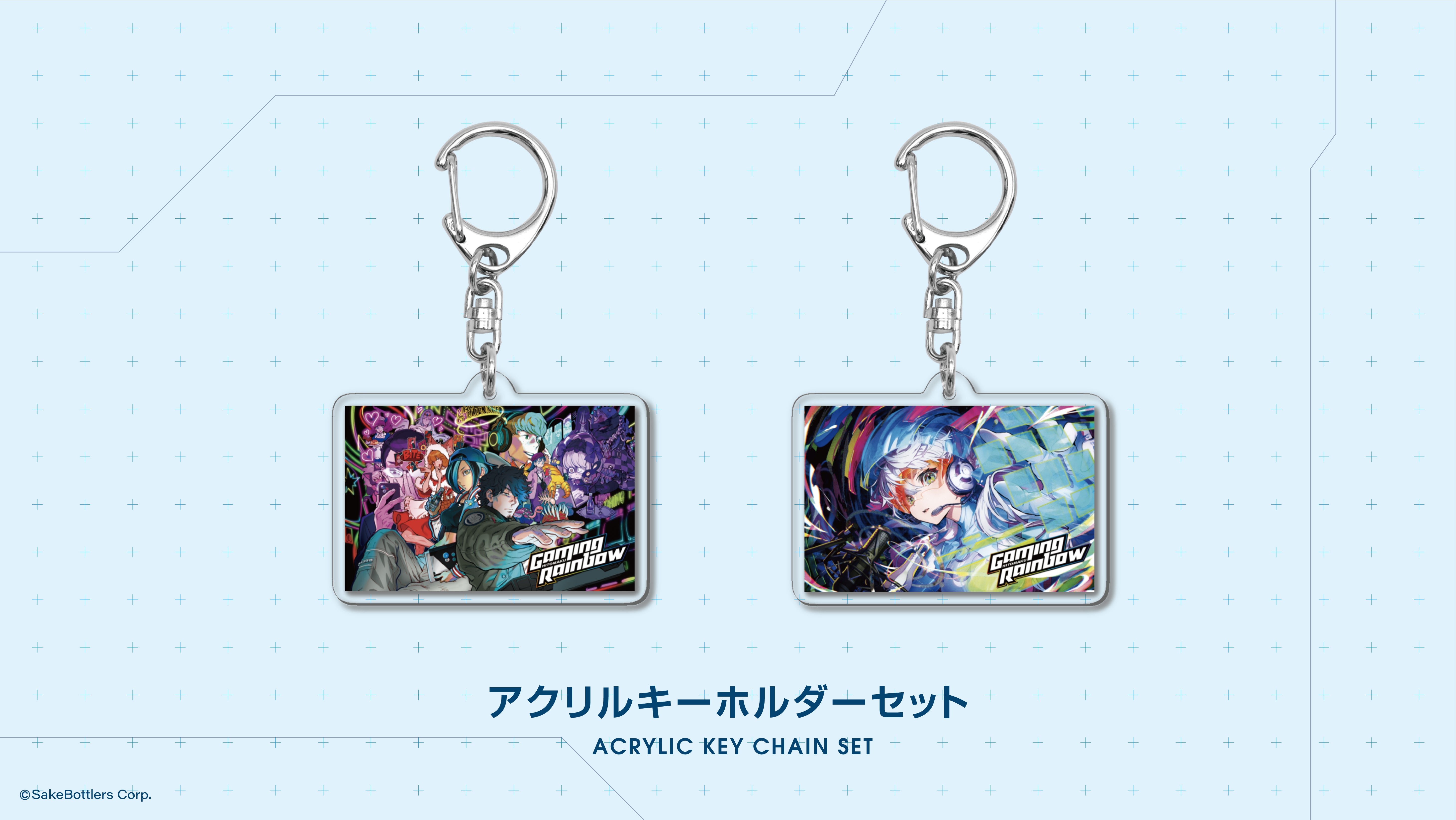 西村キヌ氏、Mika Pikazo氏のイラストのアクリルキーホルダーのセットです。裏面にはGAMING RAINBOWのロゴが入ります。
