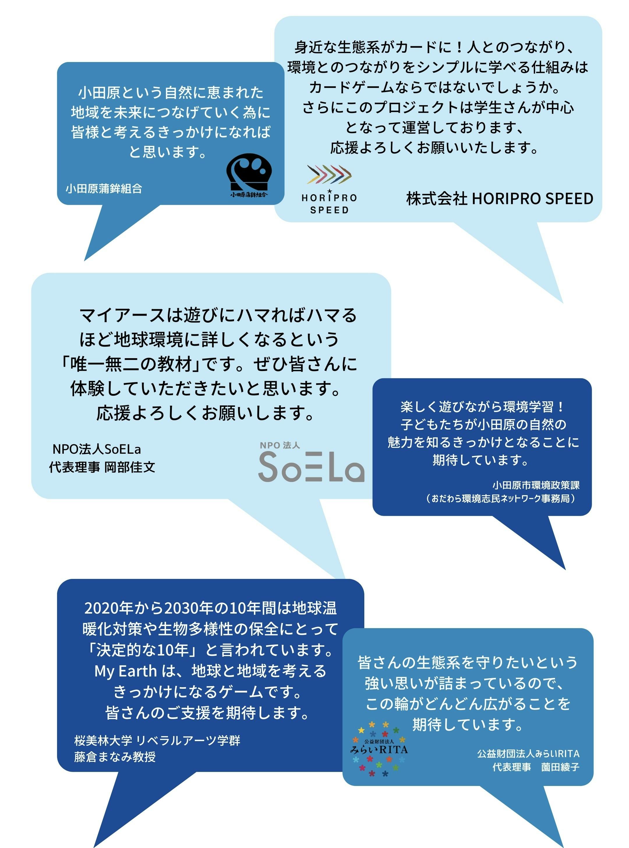 2022/11/24 19:00皆さんお久しぶりです☀クラウドファンディングの際は大変お世話になりました!お届けしたパッケージ、お楽しみいただけましたでしょうか?この度、なんとマイアース主催のイベント、【マイアースまつり 2022】を開催することとなりました!!皆さんのご支援あってのイベントです。誠にありがとうございました!以下イベント詳細です⤵︎ ⤵︎マイアースまつり2022\子どもから大人まで楽しめる、マイアース主催の環境イベント/1年かけて行ってきた相模湾プロジェクトの集大成がここに!!-マイアースまつり 2022-12/18 11:00-16:00会場:おだわら市民交流センターUMECO入場料:無料参加資格:誰でもご参加いただけます!マイアース体験会はもちろんのこと、お絵描きコーナーや函嶺白百合学園の生徒によるアクセサリー作り、様々な企業の環境活動の展示、マイアース大会、そして小田原の回遊企画まで!!ご家族で楽しんでいただけるイベントとなっております!遊びながら楽しく環境問題を学びましょう☆開催まであと1ヶ月を切りました!学生で力を合わせてイベント準備に励んでおります!たくさんの方のお越しをお待ちしております^-^ー地球環境カードゲーム My Earthとは?子どもたちに、遊びながら楽しく環境問題や生態系の仕組みを学んでもらうために開発された対戦型カードゲーム!「勉強」を「遊び」に!「遊び」が「勉強」に!クラウドファンディングを達成し、地域版パッケージ「相模湾パッケージ」完成(˶ᐢᗜᐢ˶)現在は、12/18に行われるマイアース主催の環境イベント「マイアースまつり2022」に向けて学生たちで準備中‼ もっと見る