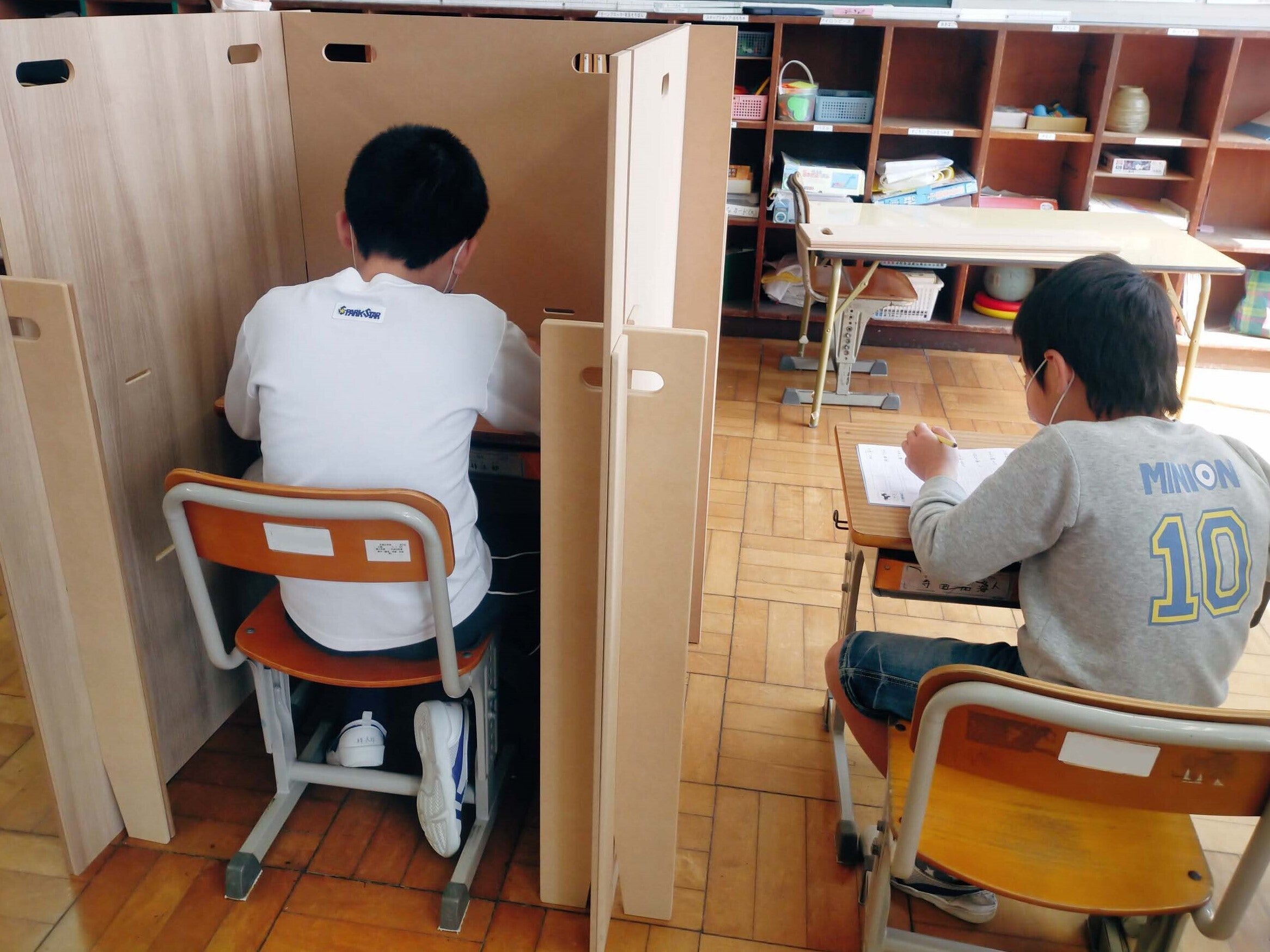 3/8(火)に掛川市の小学校に協力していただき、新しい形の間仕切りの実際に使ってみていただきました。