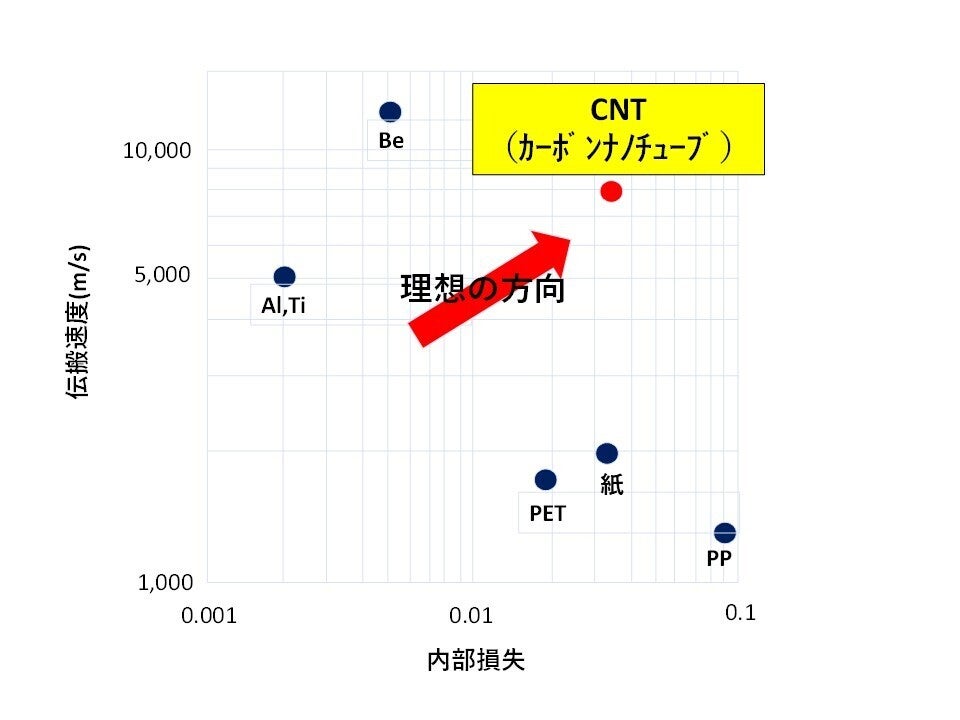 スピーカーやイヤホンの振動板や筐体だとそれ自体は響かない方がより正確な駆動、音の再現性を期待できるため、内部損失の大きな素材が向いています。