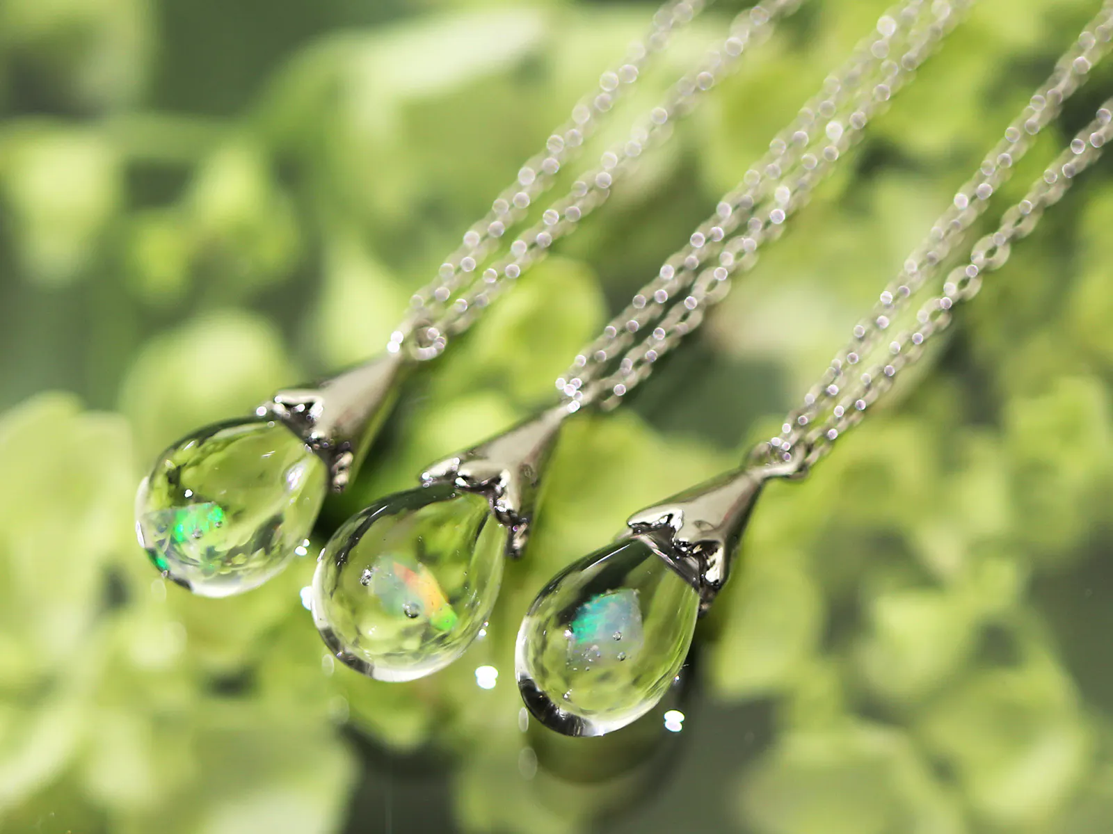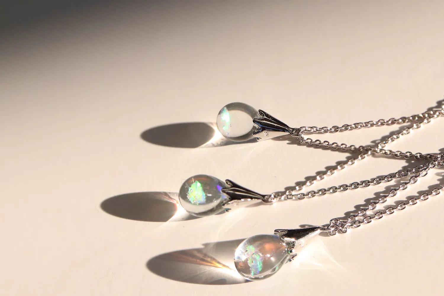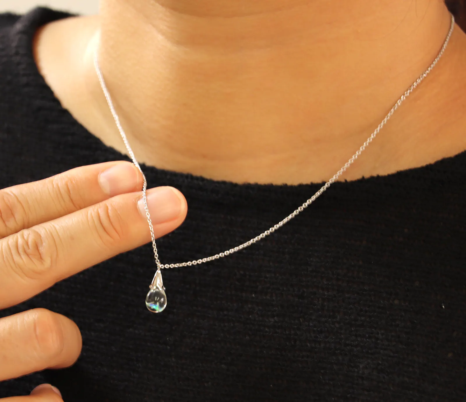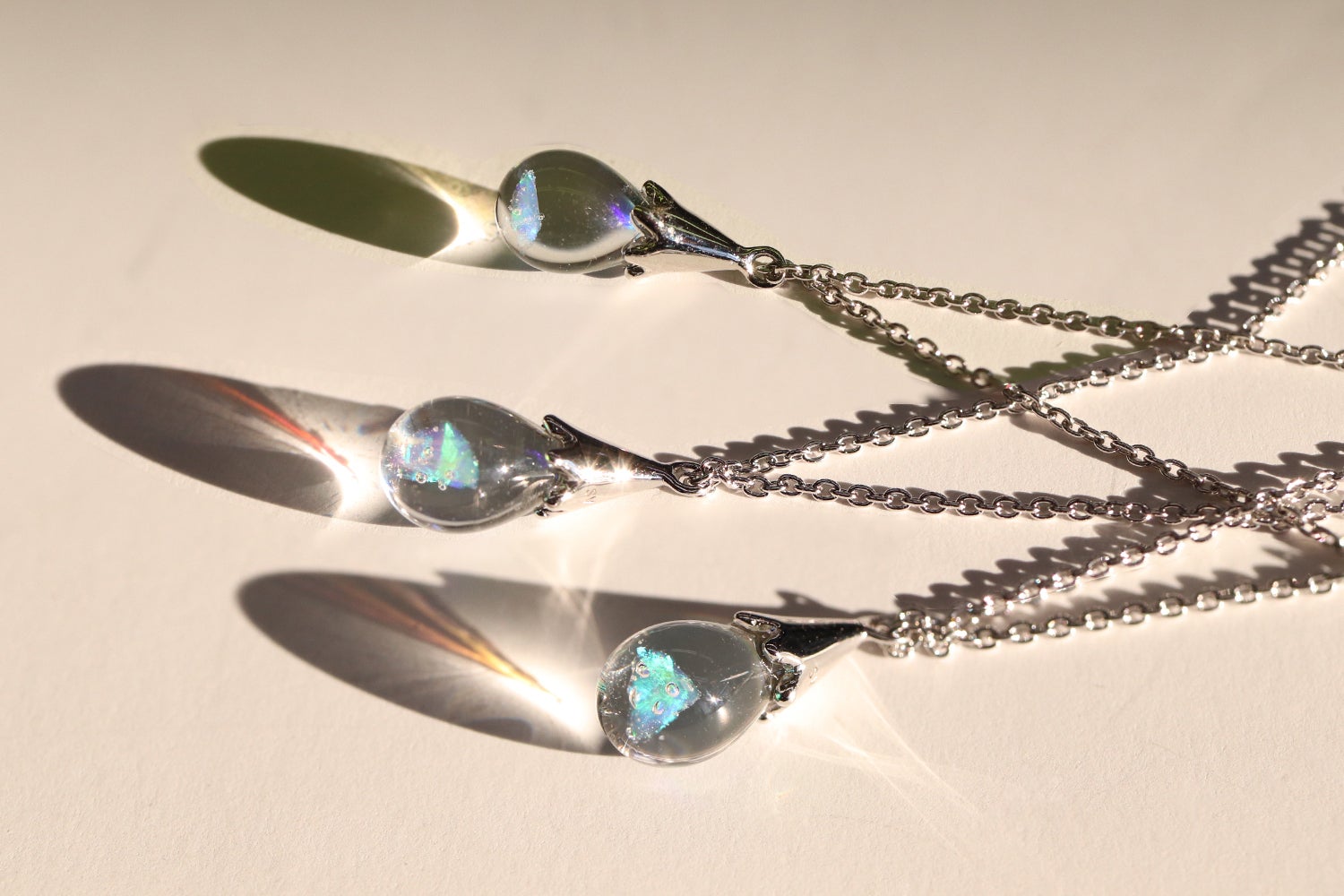 チェーン先端のしずく型のオパールガラスが、動くたびにゆらゆらと揺れて豊かに表情を変えます。