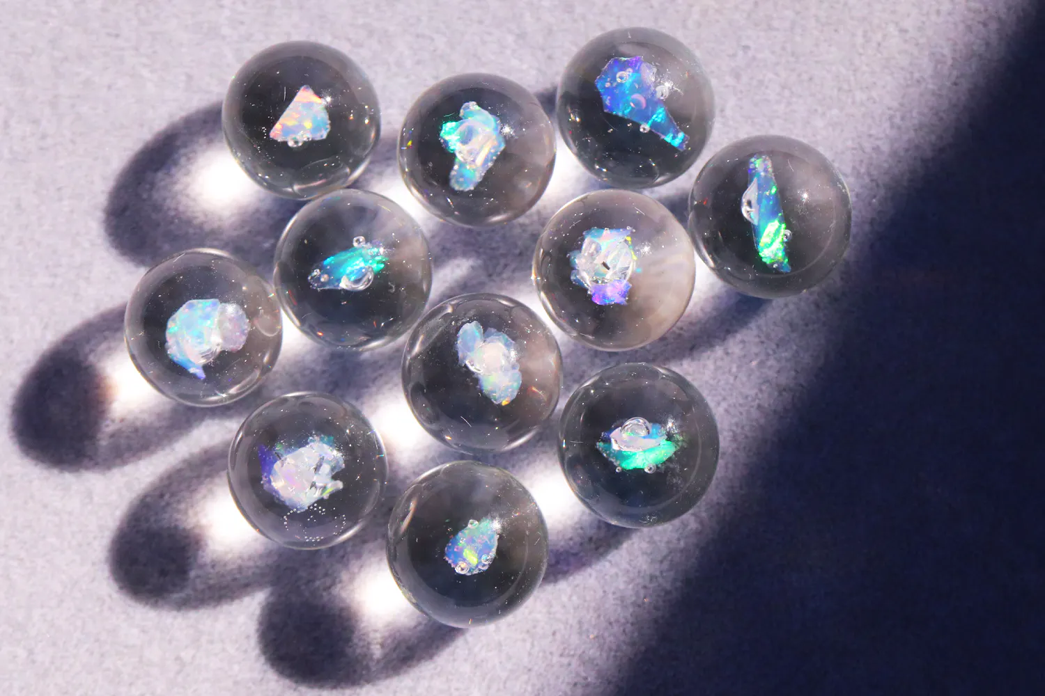 球体のガラスの中に閉じ込めたオパールは、日差しの下で光が集められさらに美しく虹色に輝きます。原石を切り出したかのようなランダムな断面が、光を乱反射して、様々に表情を変えていきます。小宇宙のように、夜空に広がるオーロラのように、あるいは海のきらめきのように・・・光と色が遊ぶ幻想的な世界に、しばし時を忘れてしまうほどです。