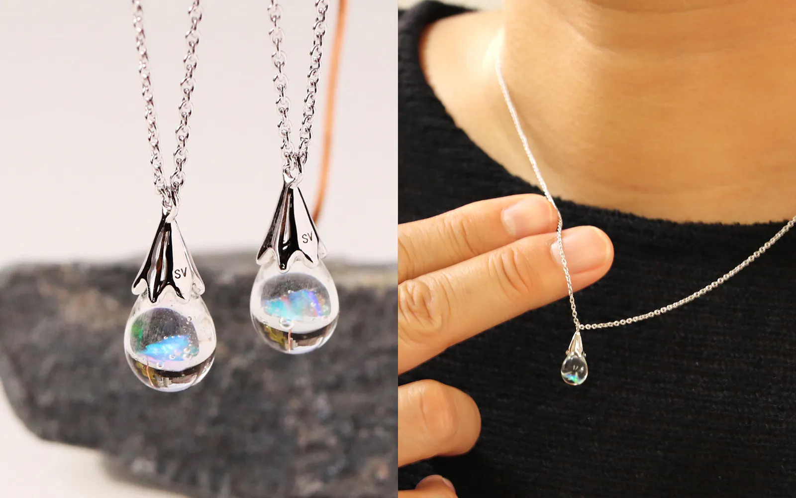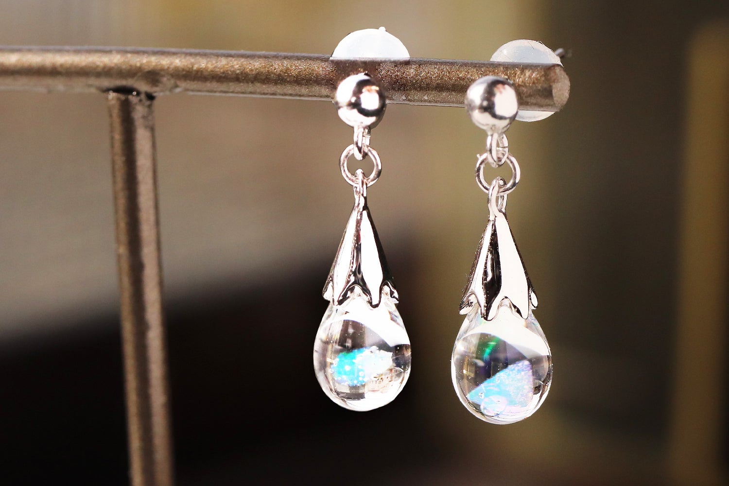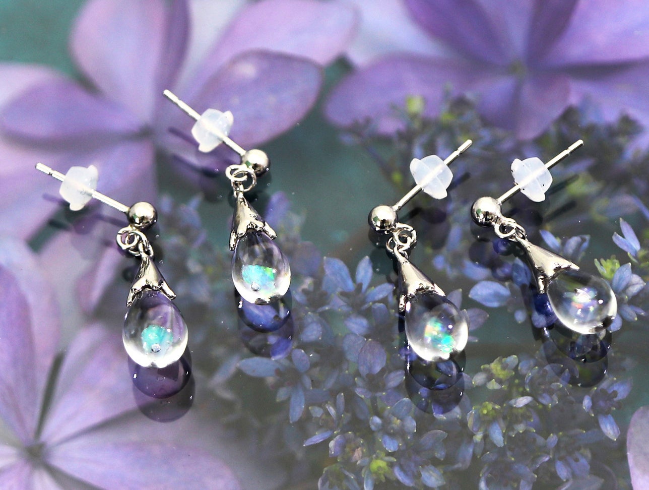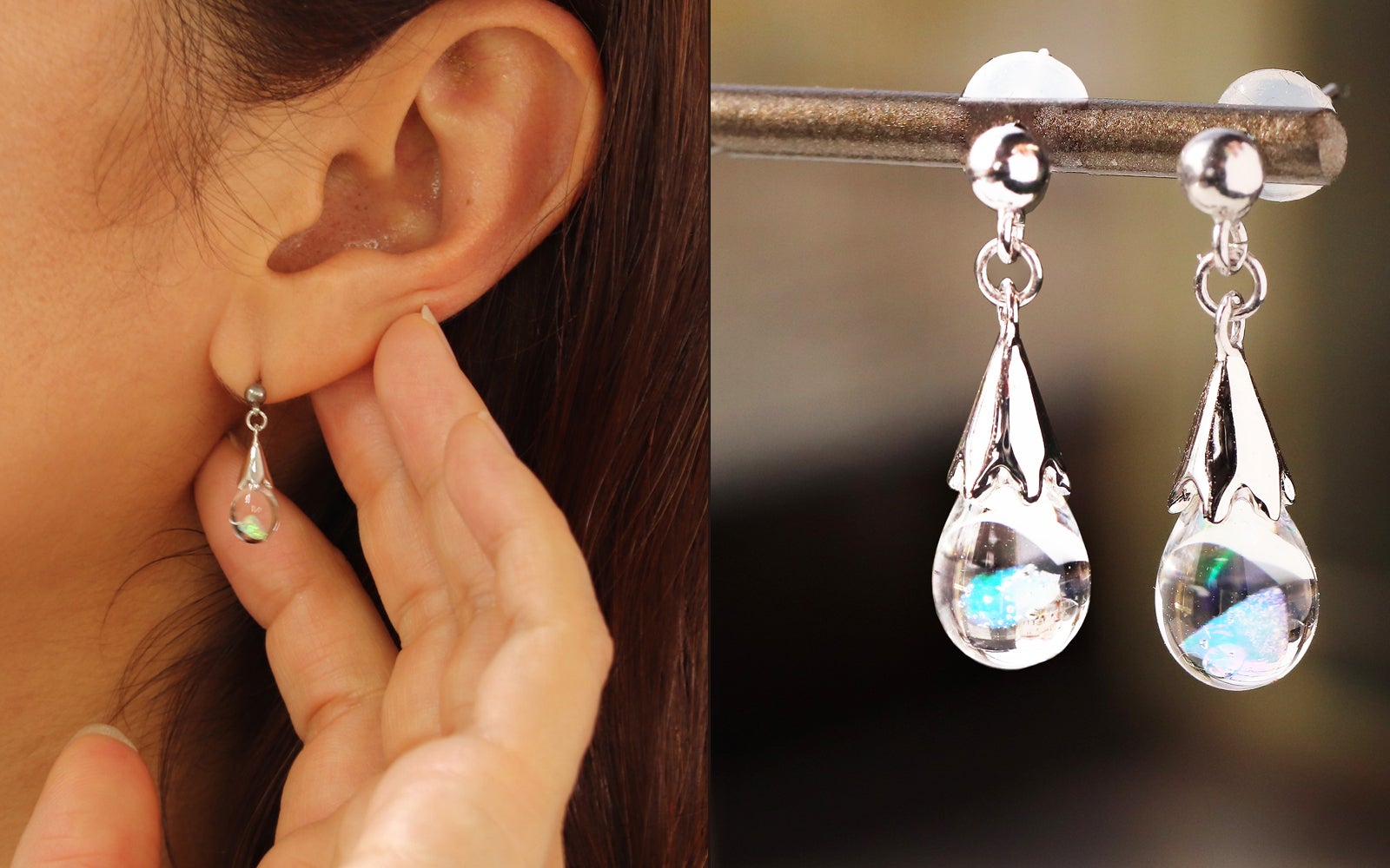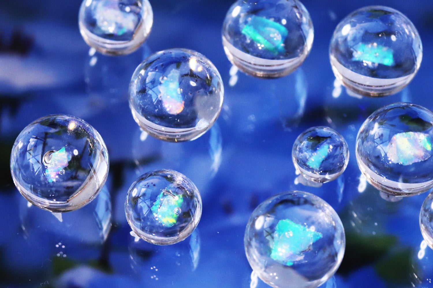 透明なガラスの球体の中に浮かぶオパールが光を反射してオーロラのように輝き、水の惑星「地球」を思わせるような清々しい美しさに満ちています。