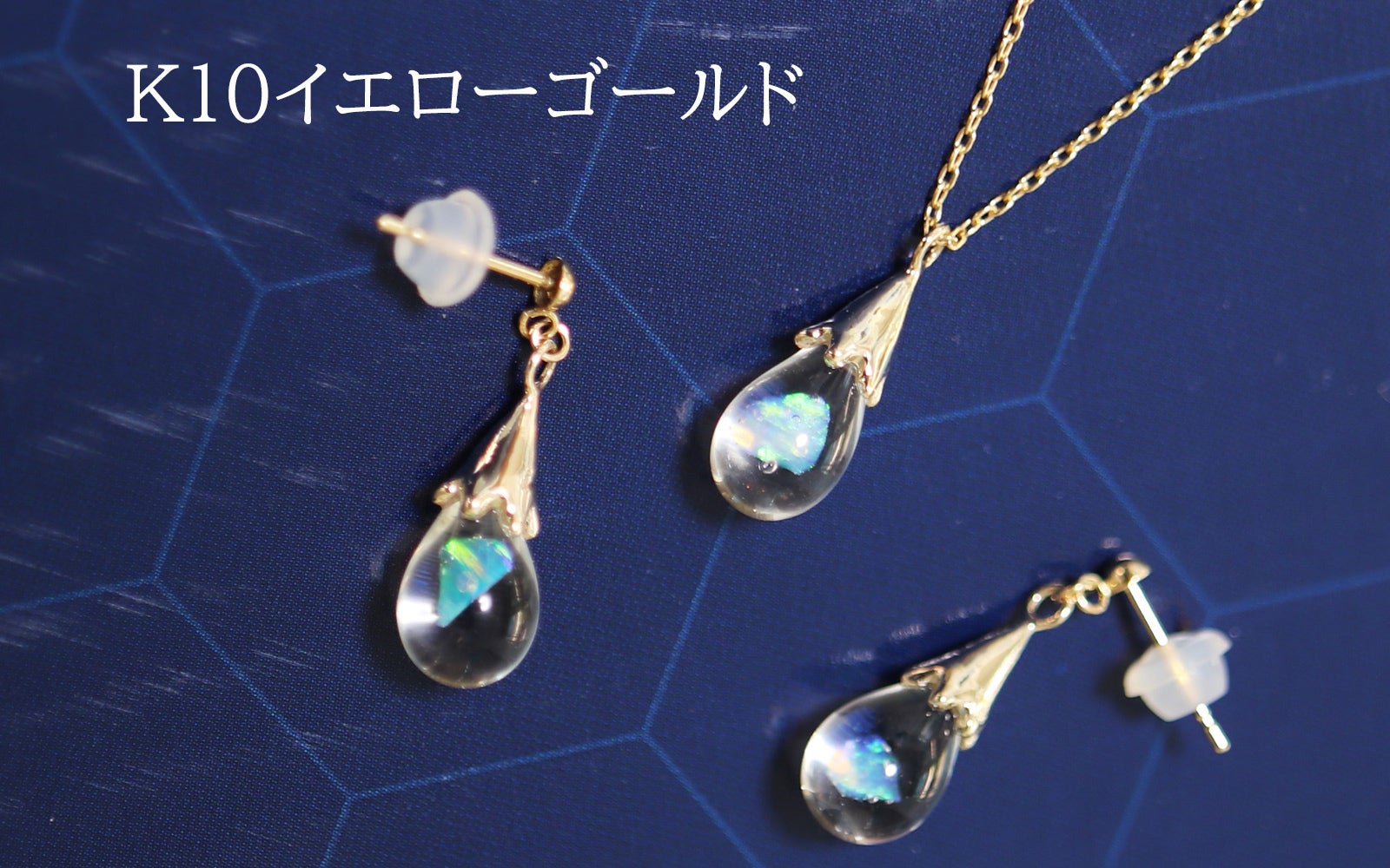 しずく型のネックレスとピアスを、シルバーとK10イエローゴールドで