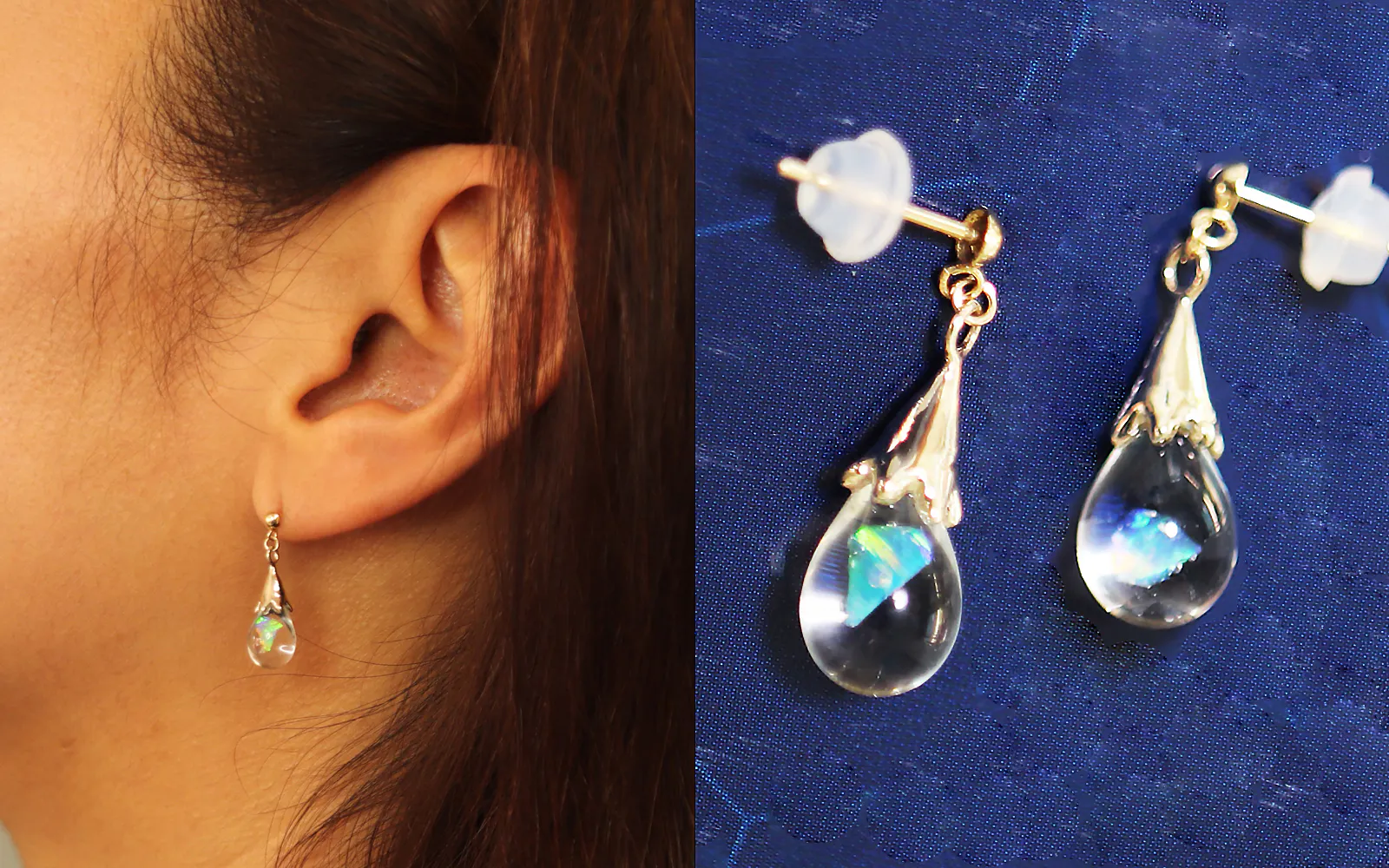 ガラスの中に閉じ込められているのは、合成オパールすなわち「クリエイテッドオパール」です。人工的に作られた宝石ですが、成分は天然オパールと同じ。鉱物が地球の長い営みの中で生成される過程を人の手によって再現した、叡智と情熱が詰まった宝石です。