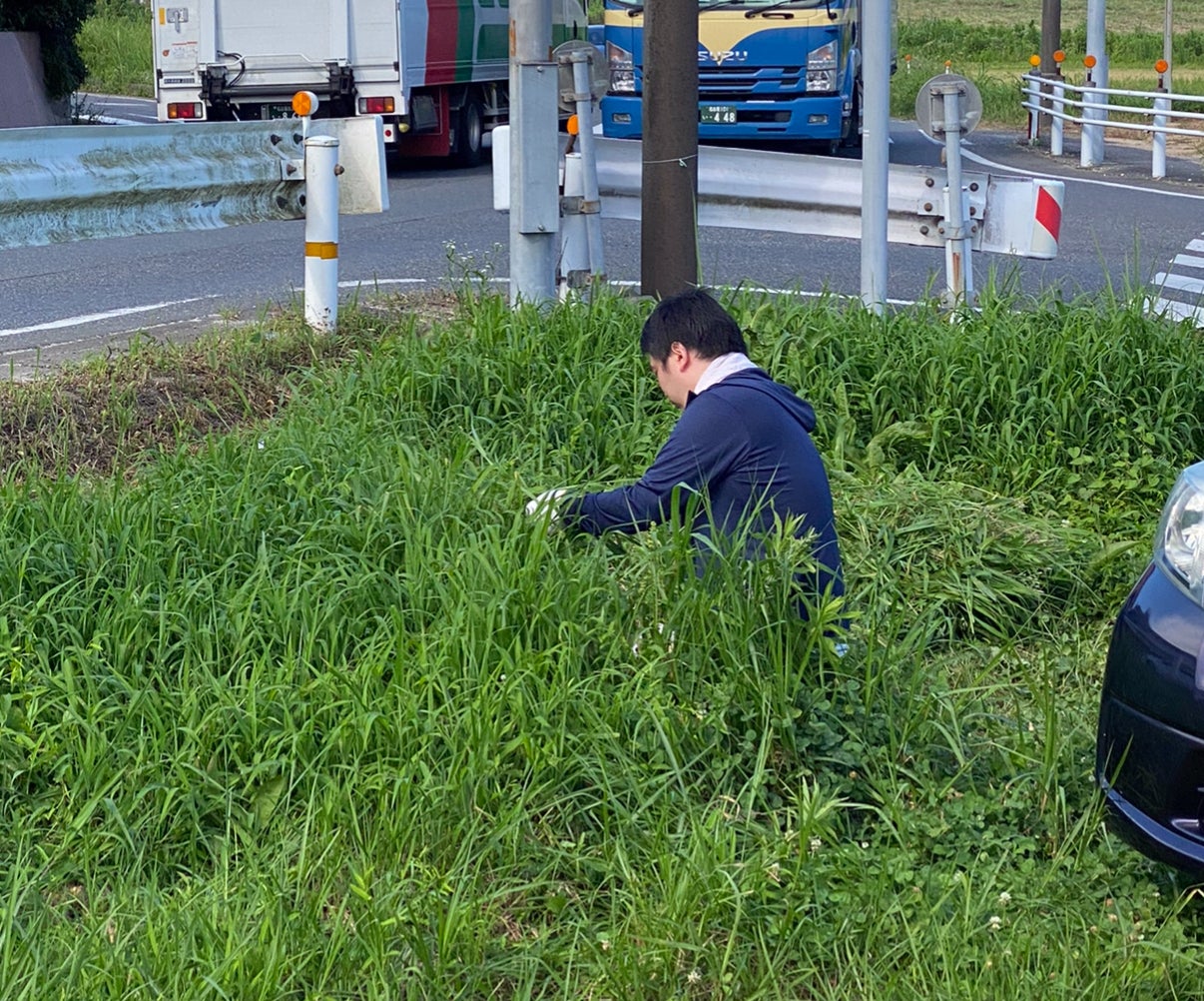 ちょうど交差点のところにある畑なので、道路の近くは「鎌」を使って草刈り!