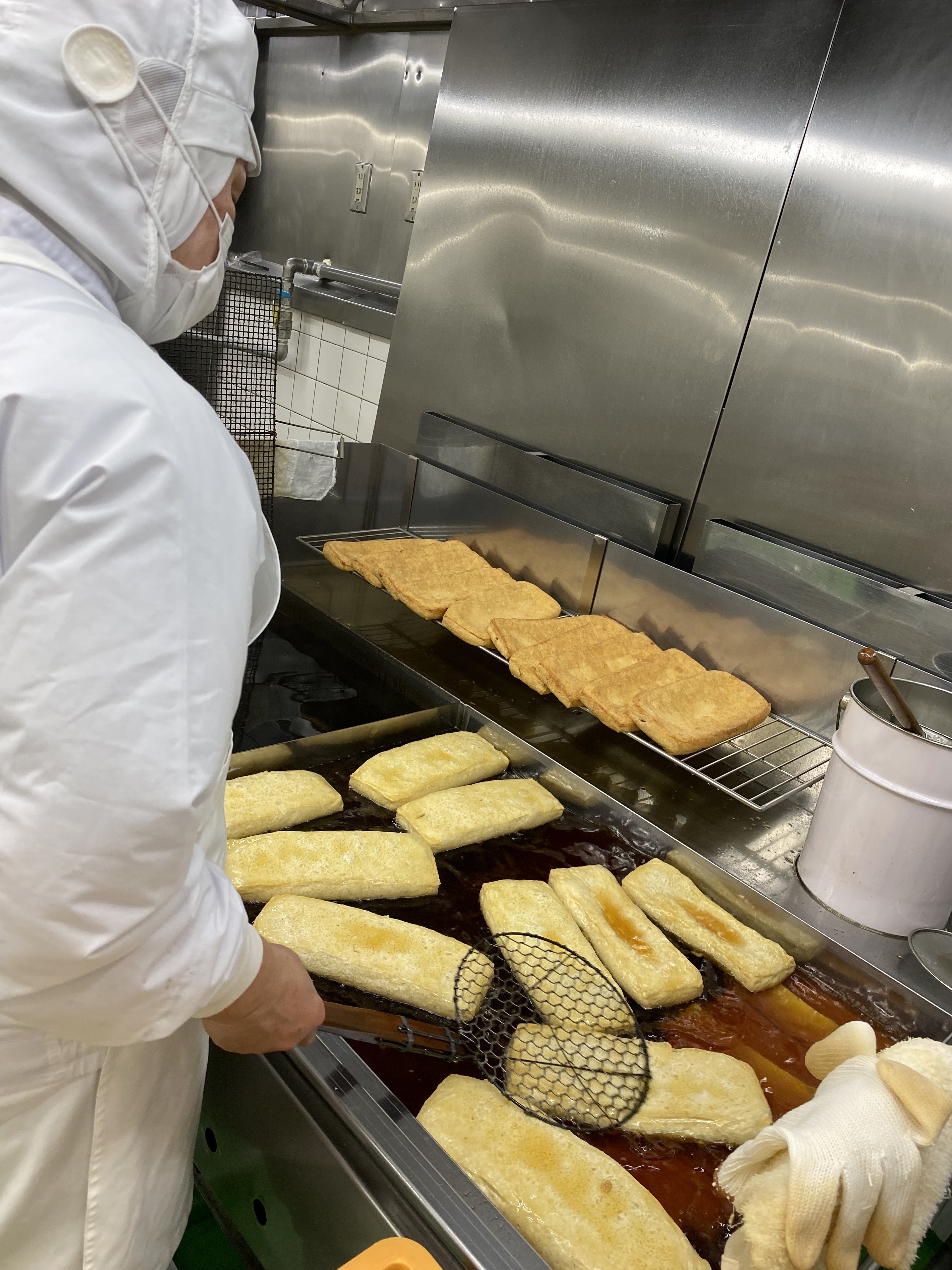 伺った時間が午後でしたので、この日のお豆腐の製造は終わってしまっていましたが、味の深さと香ばしさが美味しい「お揚げ」を作っているところはしっかり拝見させていただきました。