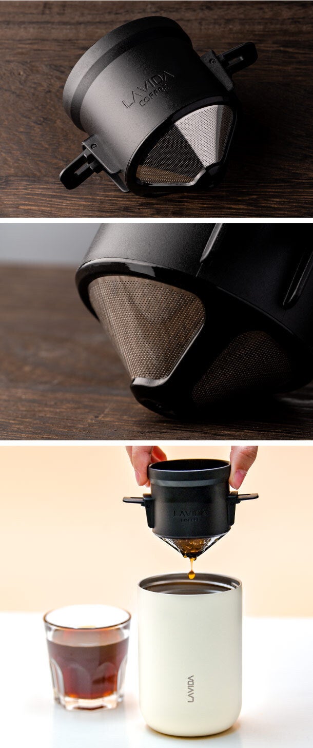 コーヒーフィルターを取り外し、両側の翼を広げてコーヒーカップにセットします。コーヒードリップ用のストッパーを上げてから、お湯をフィルターにゆっくりと注ぎ、コーヒーを抽出します。
