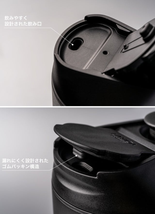 また、ゴムパッキン構造によりしっかりと飲み口をふさぎ持ち運びの際の漏れを防止します。