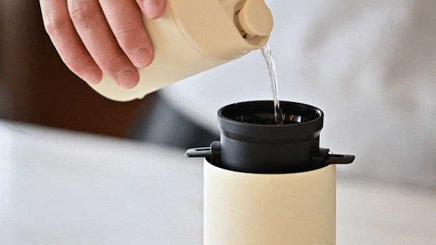 グラインダーモジュールが豆粉砕を完了したら、お湯をケトルに注ぎます。