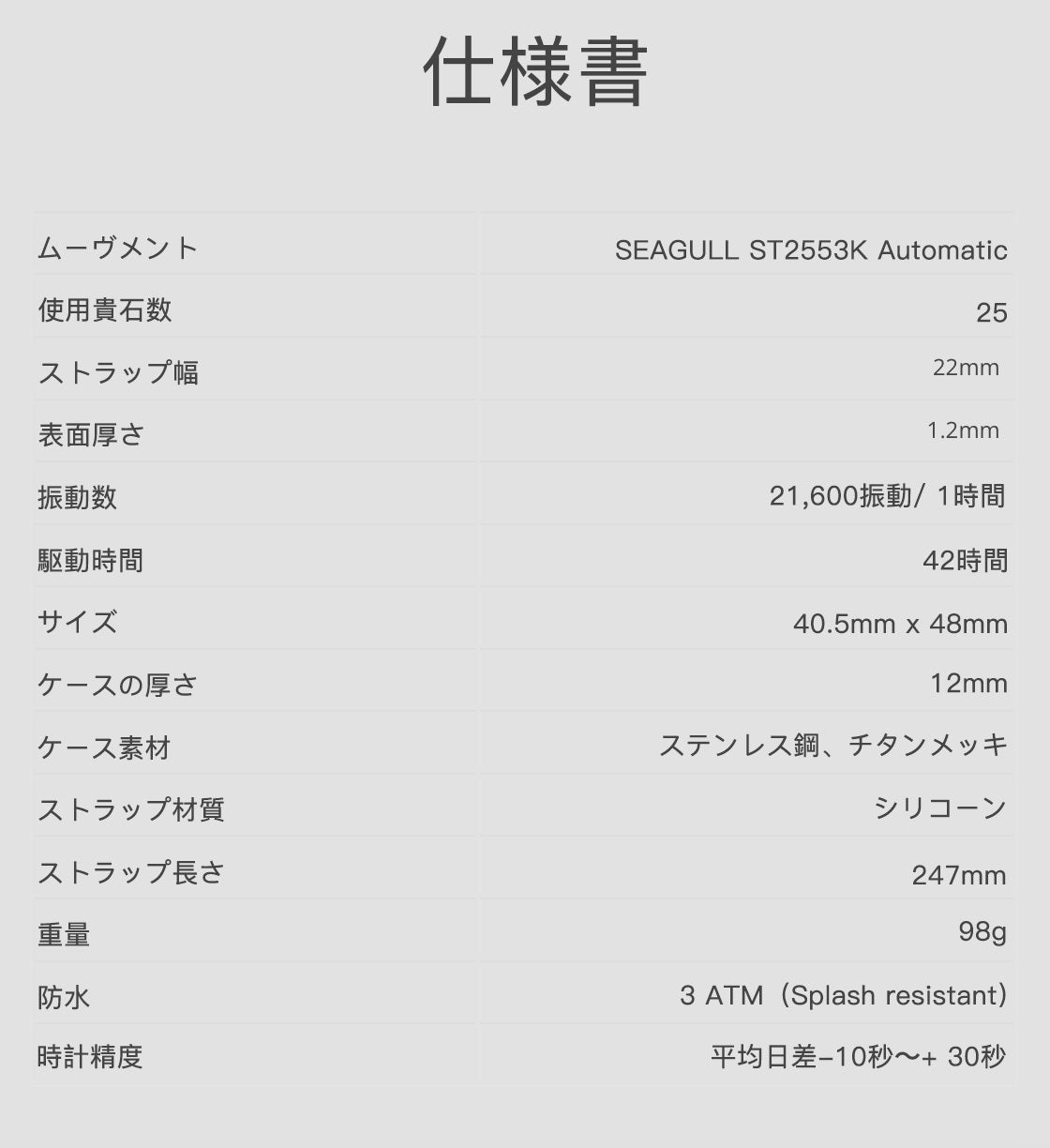SeagullオールAランクムーブメントにより、最大時間40時間パワーリザーブ、1時間あたり21600回振動、振度は最大210度、25枚の宝石入り、誤差精度は24時間-15~+30秒以内です。