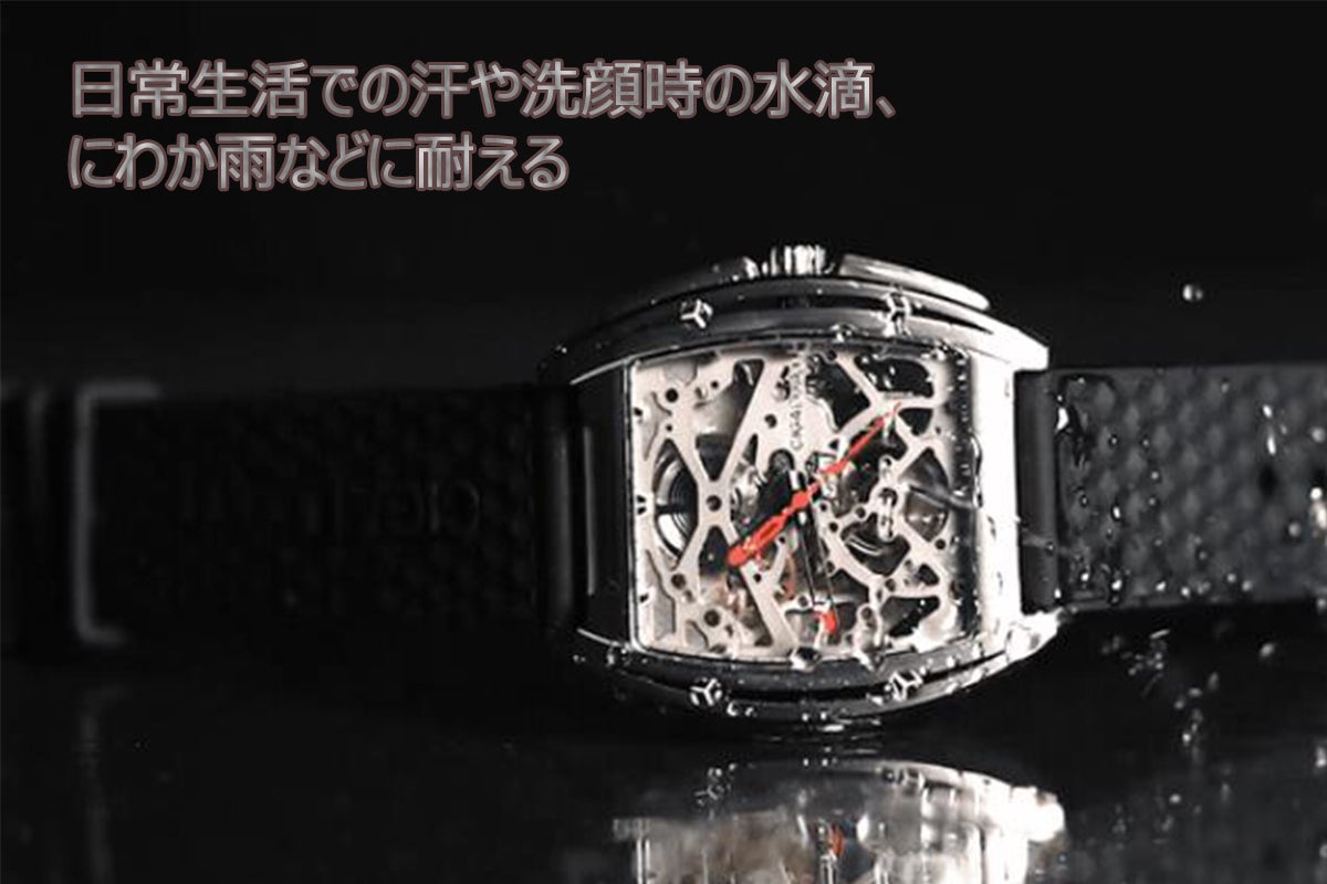 3ATM防水機能完備、日常生活での汗や洗顔時の水滴、にわか雨などに耐えることのできる防水機能がついています。