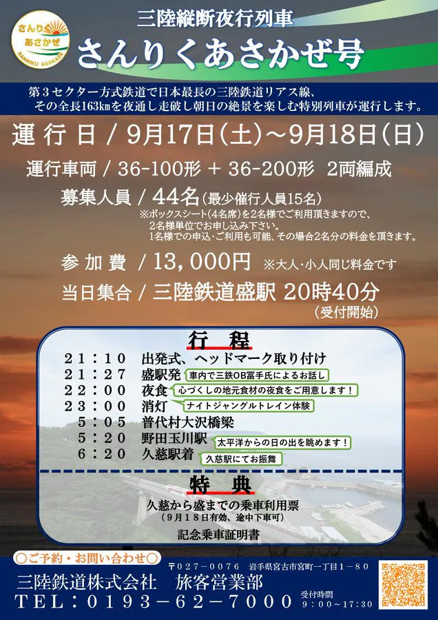 三陸鉄道には最近とてもユニークな列車旅の企画が増えています。こちら「さんりくあさかぜ号」は夜行列車が通常走らないリアス線に特別列車を走らせ、深夜に線路にやってくるシカたちを観察(ジャングルトレイン)し、太平洋に昇る朝日を列車から眺めるというツアーです。面白そうですね。来月9月17日出発とのこと、チャレンジしてみてはいかがでしょうか。