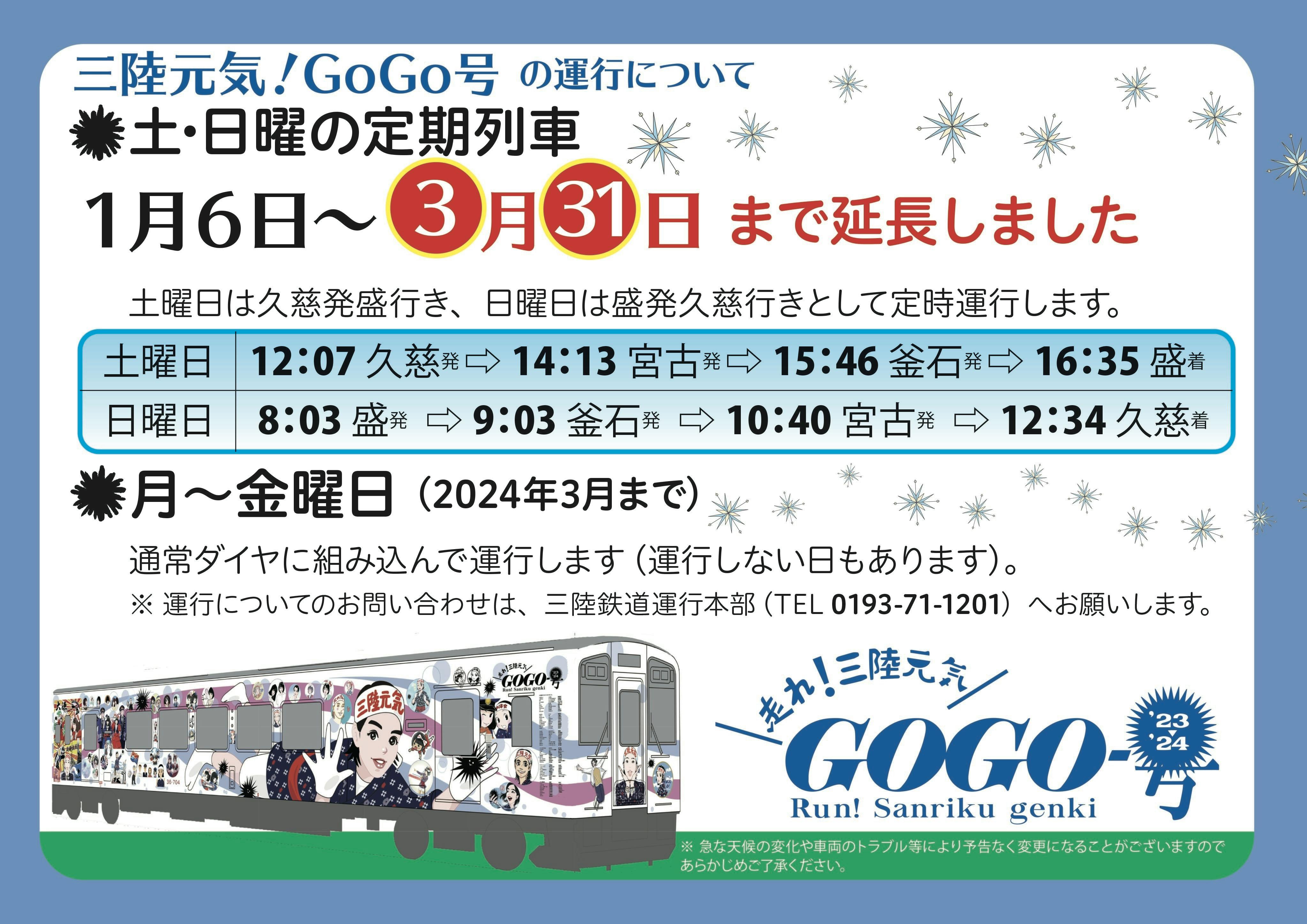 皆様。ご無沙汰しております。まなびやマニー(今西穂高)です。三陸元気!GoGo号は本日の大晦日も元気に三陸沿岸(盛駅から久慈駅までの163㎞)を走りました。今日もGoGo号に乗車された方や鉄道写真家の方が投稿写真をアップしておられます。また秋には宮古駅と久慈駅で開催されたさんてつ祭りでもGoGo号を構内展示会や体験乗車会のイベントにご利用頂きました。ここまでこられたのはひとえに皆様及び三陸鉄道様のお陰です。大変ありがとうございます。2023年4月8日の出発式からあっという間に月日が過ぎ、残り3か月となりました。そしてつい先日まで1月以降の定期運行は予定がなかったのですが、三陸鉄道様の取り計らいで、なんと3月31日まで土曜日曜は固定ダイヤが延長となりました!