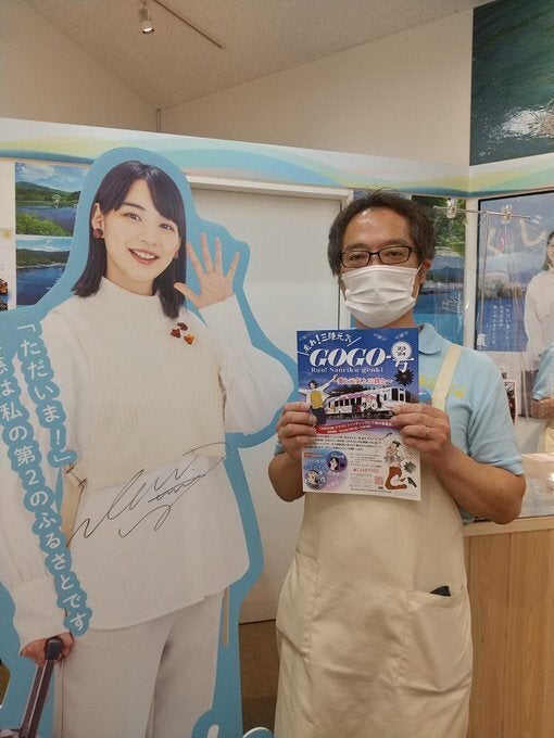 東京交通会館のおかえり館(気仙沼・久慈・福島情報ステーション)にご挨拶してきました。久慈市役所様を通じてチラシの配布をお願いしましたところご快諾を頂き、入り口の脇の目立つ場所にチラシスタンドと共におかせて頂きました。店長さんはとても気さくな方でのんちゃんとの写真をお願いしたら「じゃチラシと一緒に」って自ら仰ってくださいました。 ご協力ありがとうございます。また伺います。 店内は3つの町の物産やテレビドラマに因んだグッズも売られていて、久慈で見かけたあまちゃんタオルなどもここで買うことができます。銀座にお越しの際は是非お寄りください。