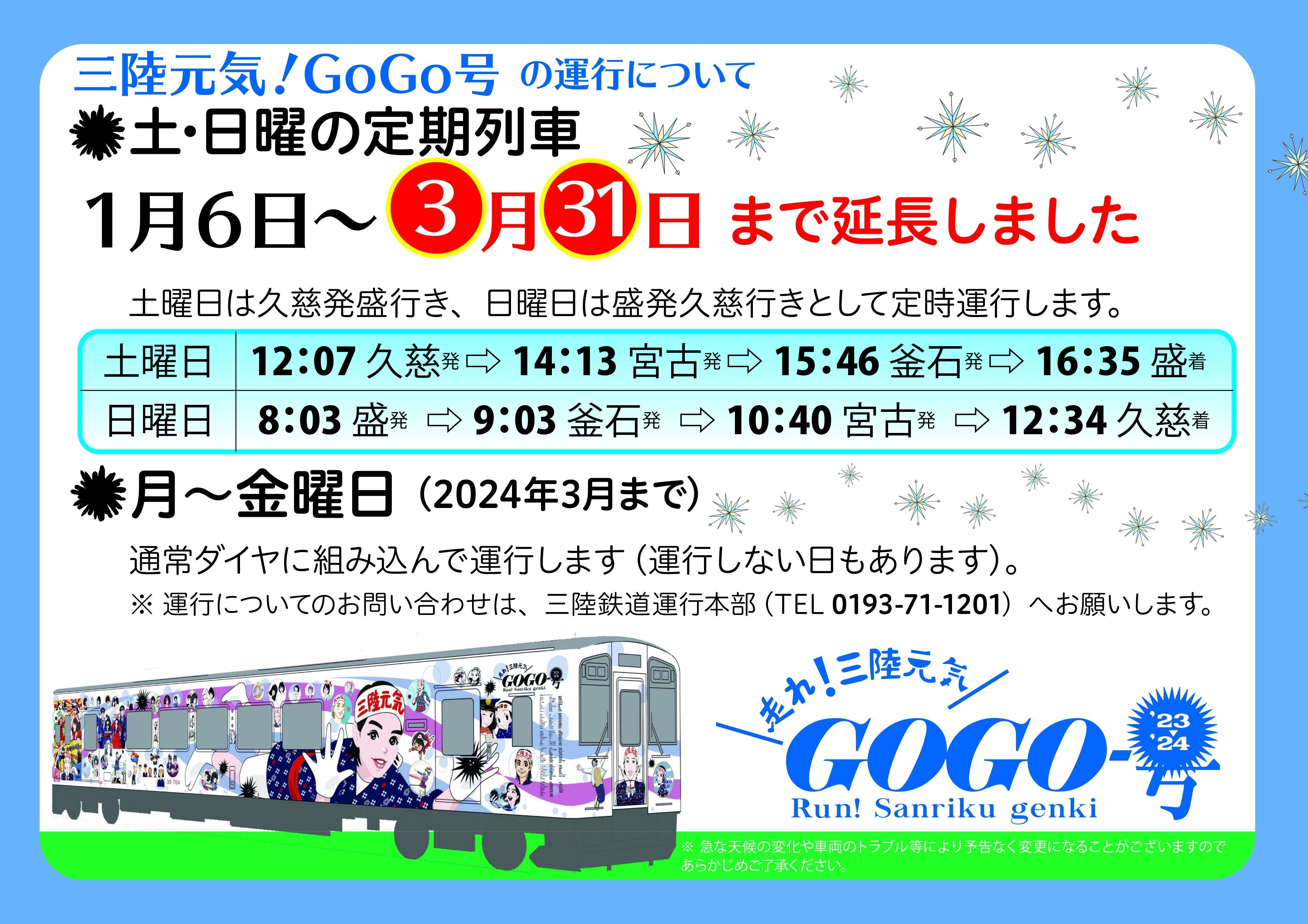 皆様。ご無沙汰しております。まなびやマニー(今西穂高)です。三陸元気!GoGo号は本日の大晦日も元気に三陸沿岸(盛駅から久慈駅までの163㎞)を走りました。今日もGoGo号に乗車された方や鉄道写真家の方が投稿写真をアップしておられます。また秋には宮古駅と久慈駅で開催されたさんてつ祭りでもGoGo号を構内展示会や体験乗車会のイベントにご利用頂きました。ここまでこられたのはひとえに皆様及び三陸鉄道様のお陰です。大変ありがとうございます。2023年4月8日の出発式からあっという間に月日が過ぎ、残り3か月となりました。そしてつい先日まで1月以降の定期運行は予定がなかったのですが、三陸鉄道様の取り計らいで、なんと3月31日まで土曜日曜は固定ダイヤが延長となりました! 春、夏、秋を駆け抜け、いよいよ4つめの季節、冬の北三陸を快走します。(「あまちゃん」では春子と夏ばっぱ、アキ(秋)ちゃんまででしたからこれで「あまちゃん」越え!(笑)) 冬は「こたつ列車」など寒い季節ならではのイベント列車が走ります。私も乗車しましたが冬の味覚だけでなく、添乗される三鉄社員さんの楽しいトークもお薦めです。寒い時期だからこその東北らしさを是非体験してみて下さい。それでは良いお年を!平日の運用は2日前にわかりますので三陸鉄道へお問い合わせください。