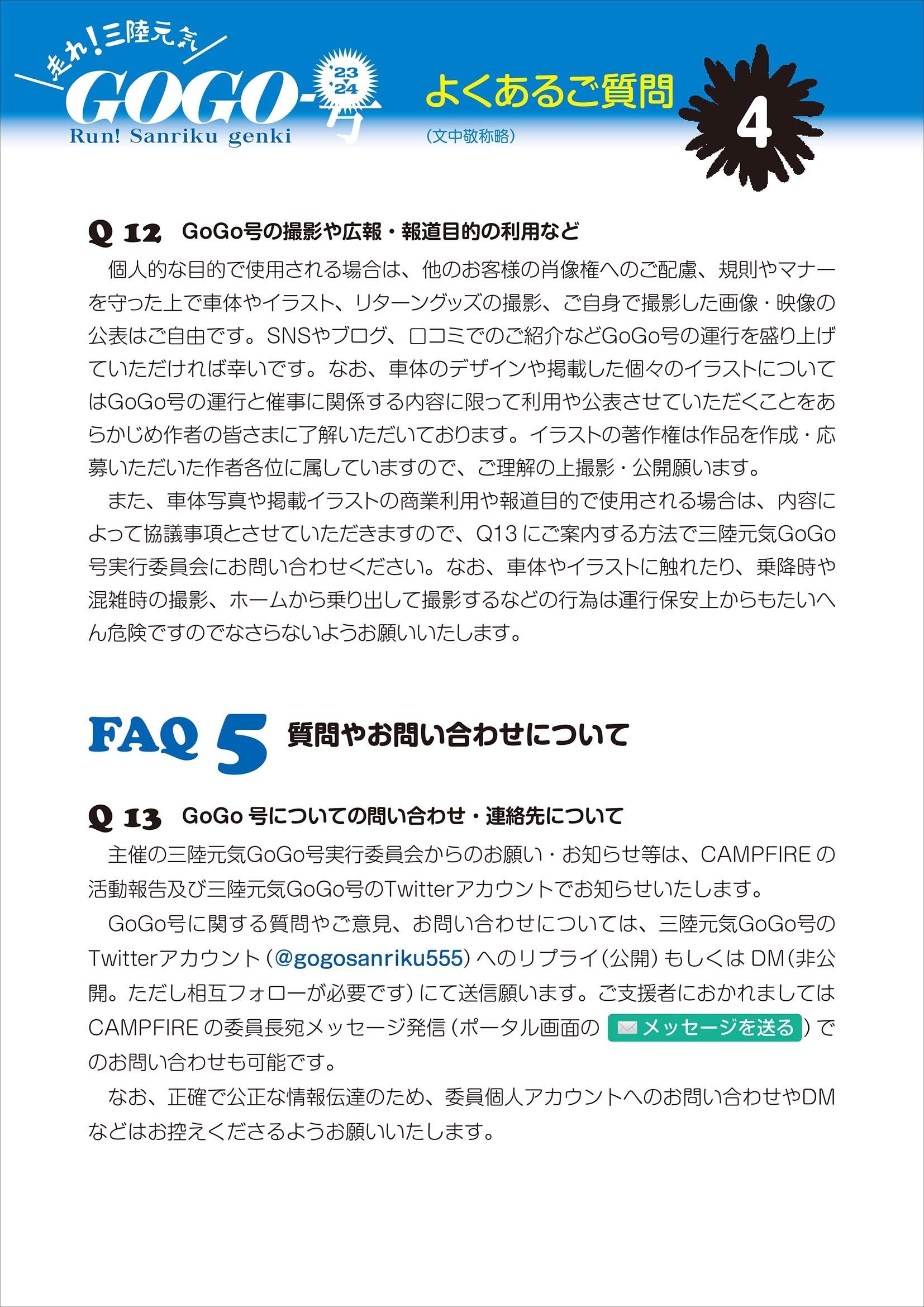 皆様。今西穂高(まなびやマニー)です。 これまでにいただいた質問やお問い合わせへの回答や、準備のご報告などをかねてGoGo号のFAQ(よくある質問)をつくりました。 内容も更新していきますので、いましばらく出発進行!!の日をお楽しみにお待ちください。 4回続けての投稿となります。4ページ目(最後)です。(三陸元気GoGo号に関するFAQ4/4ページをアップします。)