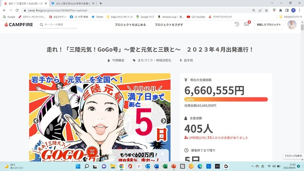 皆様。今西穂高(まなびやマニー)です。おかげさまで、昨日9月5日、目標金額666万円を達成しました。皆様からのご支援に心から感謝申し上げます。遅れてのリターン品追加、さらに終了1週間前に最後のリターン品登録などでご迷惑をおかけしたかもしれません、お詫び申し上げます。さてこれ以降に頂くご支援をどう活用するか、急ぎ検討しました。「あま絵」「のん絵」を三陸鉄道の車両に描くだけでなく、街の中でご覧いただけるようしたく存じます。イラスト展示のための会場費用、運営コスト、チラシ作成費等を想定し、ストレッチゴールを777万円と致します。開催地・期間等は今後詰めて参ります。プロジェクトのことを今週知って、急ぎ支援しようとされる方のお気持ちも無駄にせず、岩手県の地域振興にわずかでも役立てることができればと思います。残りはあと数日となりますが、どううか最後までご声援をお願いいたします。