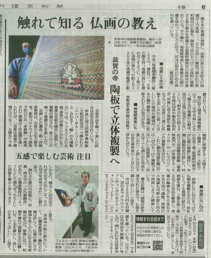 2022/07/24 08:00改めまして、今回の「触れる陶板地蔵曼荼羅製作プロジェクト」にご支援を賜り誠にありがとうございました。みなさまのご支援のおかげで陶板地蔵曼荼羅製作の目処が立ちました。ありがとうございます。10月の完成を目指して大塚オーミ陶業株式会社さまにがんばっていただいているところです。完成の際にはぜひ触れにきてお地蔵さまとご縁を結んでください。お待ちしております。なお、返礼のお品につきましては準備が整い次第順次発送いたしますので、大変申し訳ございませんがいましばらくお待ちください。本当にありがとうございました。 もっと見る読売新聞さまに取り上げていただきました!