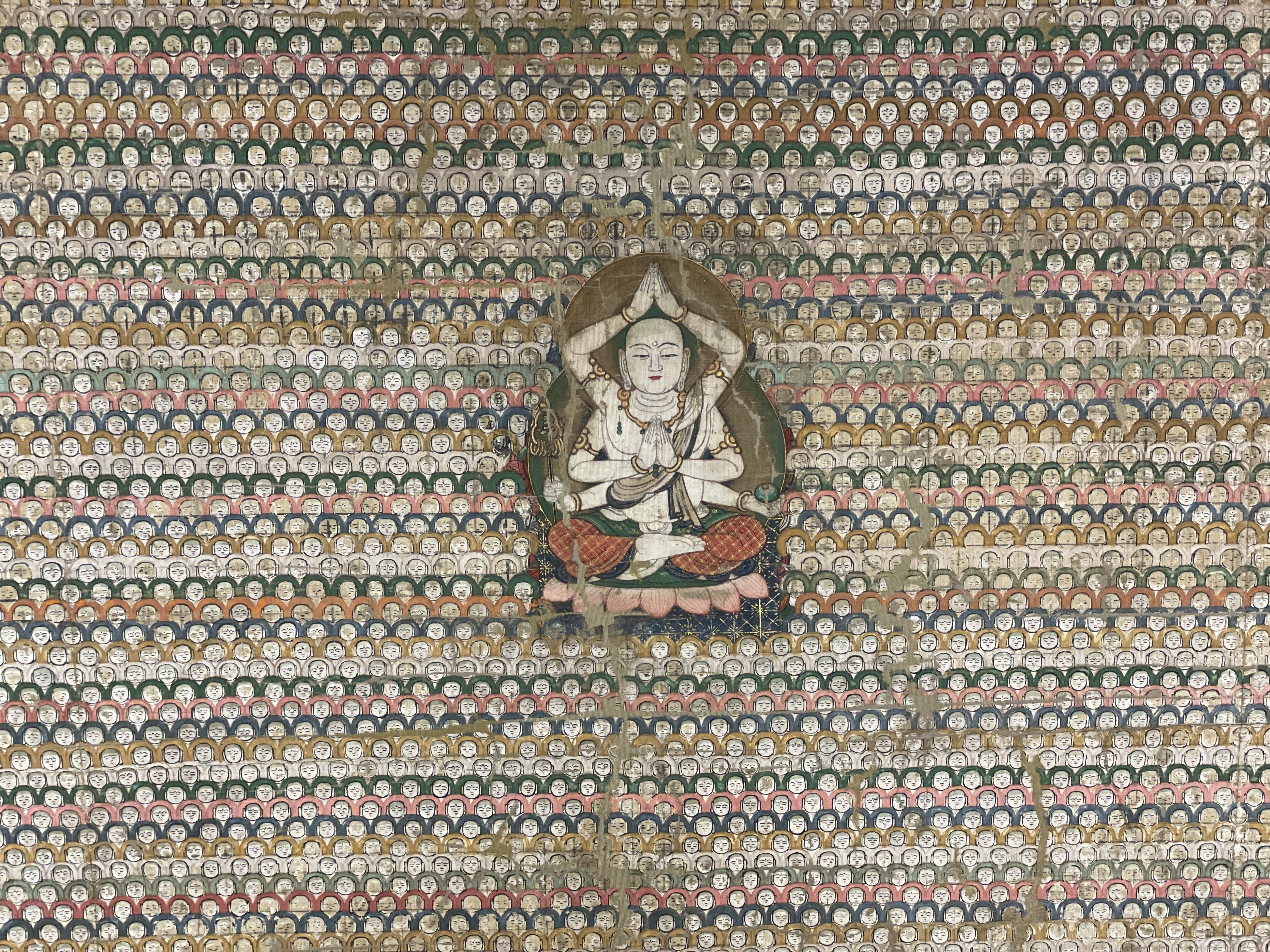 室町時代初期の作。中央に六本の腕があり錫杖と宝珠を持った地蔵菩薩が描かれ、一万千八百五十一体もの小さな地蔵が並ぶ、世界に一つしかない地蔵曼荼羅。