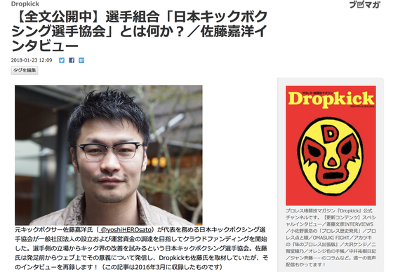 プロレス格闘技マガジン「Dropkick」公式チャンネルにインタビュー記事(2016年3月の再録記事)が掲載されました。