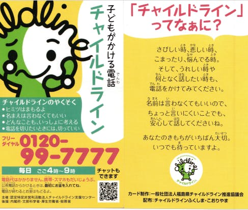 子どもからの相談内容は家庭の問題、学校での友人関係、いじめ、虐待、自身のことなど多岐にわたります。 チャイルドラインへの電話は、フリーダイヤルのため通話料は一切かかりません。福島県内の18歳未満の子どもたち用に、悩みを抱えたときに相談できるようフリーダイヤルが記載されたカードを作成し、福島県や福島県教育委員会などの協力を得て、福島県内の小・中・高校生1人に1枚、総数22万枚を配布しています。カードの大きさは、名刺サイズで作成して生徒手帳に挟めるようにし、思い立ったらすぐ電話をかけられるような仕様にしています。