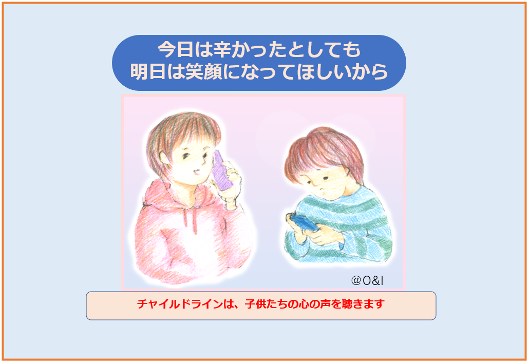 私たちは、辛いときや寂しい時に誰かに話を聞いてもらうことでほっとすることがあります。チャイルドラインは、子どもたちが家族や先生、友達などに話せないことも安心して聞いてもらうことができる相談先です。1人でも多くの子どもたちが、悩んでいることや悲しかったこと・辛いことを誰かに聞いてもらい気持ちが少しでも楽になることで一歩でも前に進める力につながることを信じています。