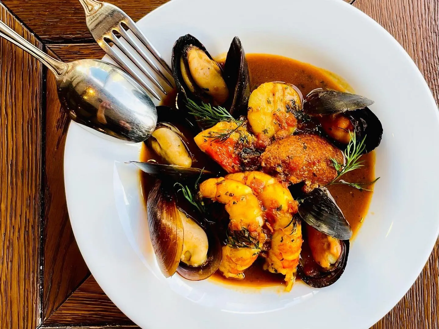 【ブイヤベース】南フランスのプロヴァンス地方 マルセイユの代表的な海鮮料理です。三浦の三崎港の魚介類と香味野菜、スパイス、サフラン、白ワイン、調味料を入れ、煮込んだ海鮮風味の濃厚なスープの寄せ鍋です。バケットを浸していただくのも美味しいですよ。