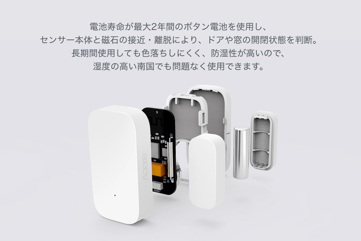 Aqaraドア・窓センサーは、電池寿命が最大2年間のボタン電池を使用し、センサー本体と磁石の接近・離脱により、ドアや窓の開閉状態を判断します。長期間使用しても色落ちしにくく、防湿性が高いので、湿度の高い南国でも問題なく使用できます。