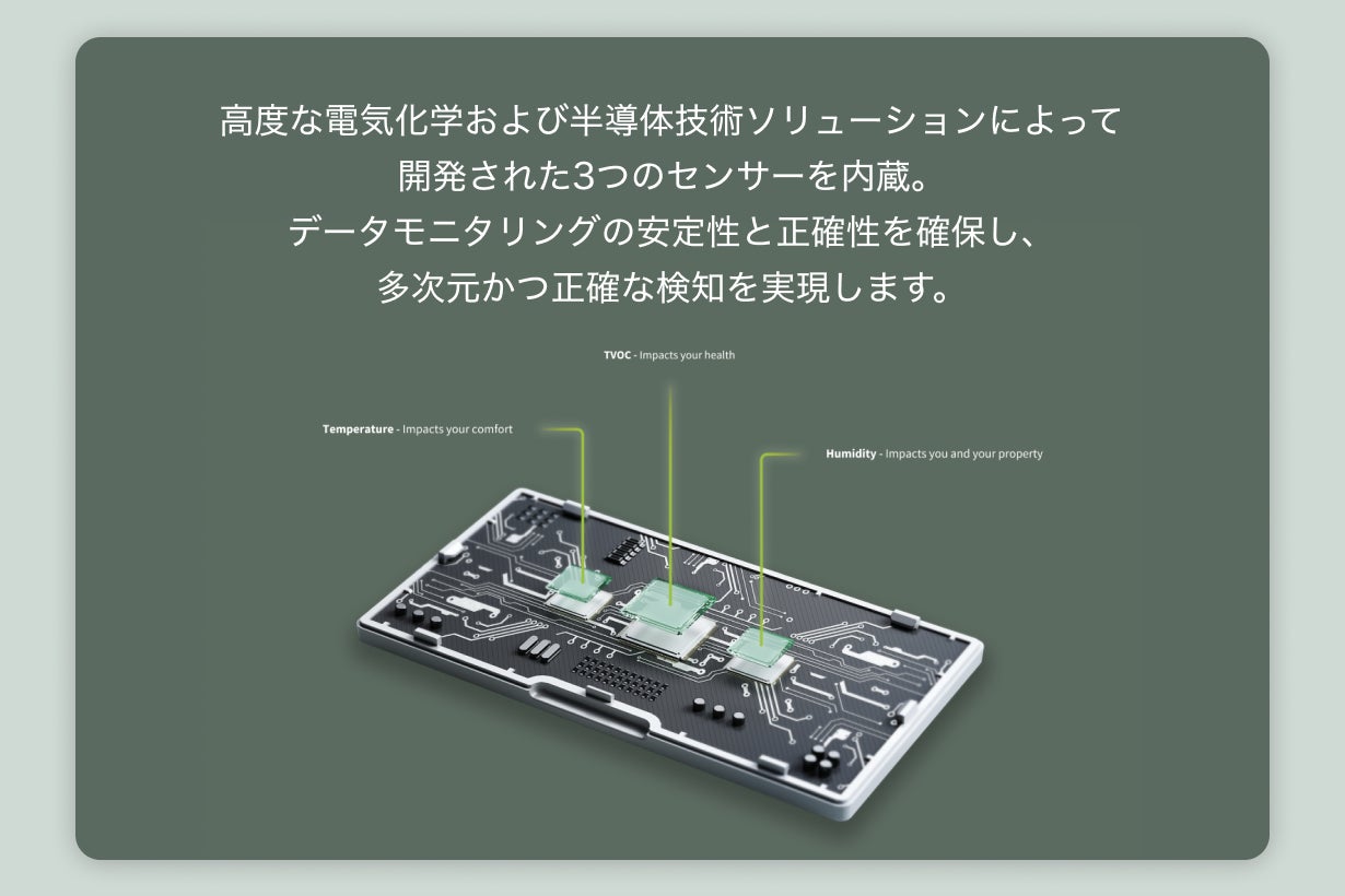 あらゆるところに設置し、温湿度・TVOC数値が事前に設定した数値範囲から外れると、リアルタイムでスマホにアラート通知が届き、ハブM2がデータを受信します。それと同時に連動しているエアコンや空気清浄機がハブM2から指示を受け、自動的に起動します。
