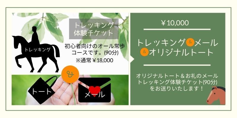 ・ご支援後、お礼のメールと、大和ホースパークオリジナルのトート・大和ホースパーク自慢のトレッキングを体験チケットをお送り致します。