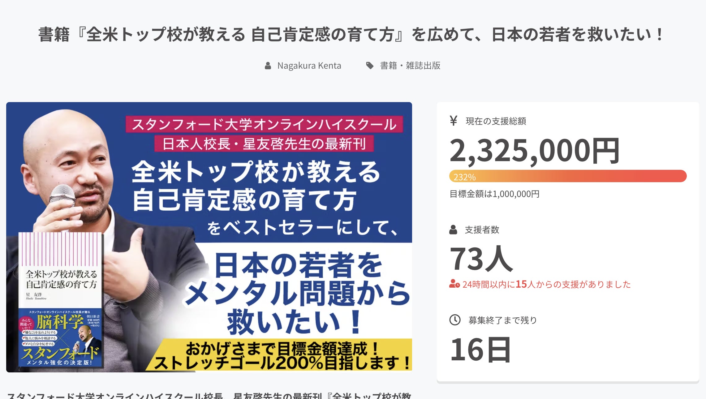 ご支援いただいた皆様へ。この度、売り切れになっていた人気リターン「星校長のオンライン講演 主催権利」を1枠だけ追加いたしました!その他にも、・長倉とのランチコンサル(4/7)・長倉の講演 主催権利・星校長の各種セミナー映像・星校長のサロン有料コンテンツなどここでしか手に入らないリターンが数多くありますので、よろしければこの期間にお求めください!https://camp-fire.jp/projects/view/564320(ご支援はこちらから)また、「関東と関西で電車広告を出す」という目標に向けて現在ストレッチゴール400%を目指しております!中間ゴールである350%を達成した際にはご支援者さま全員に「未来の教育」「ギフティッド教育」について星校長と長倉がスタンフォード大学で対談した「非売品の映像(約60分)」も提供させていただきます。メンタル問題に苦しむ若者を救うため、日本の未来を少しでも良くするために、最後まで応援いただけると幸いです!https://camp-fire.jp/projects/view/564320(クラファンご支援はこちらから)よろしくお願いいたします!