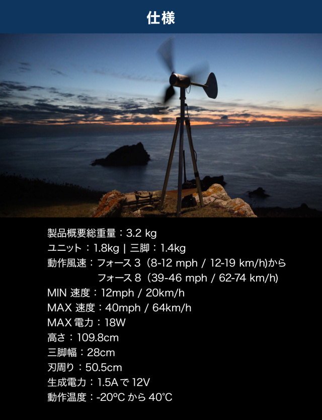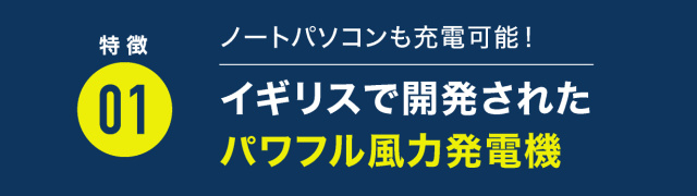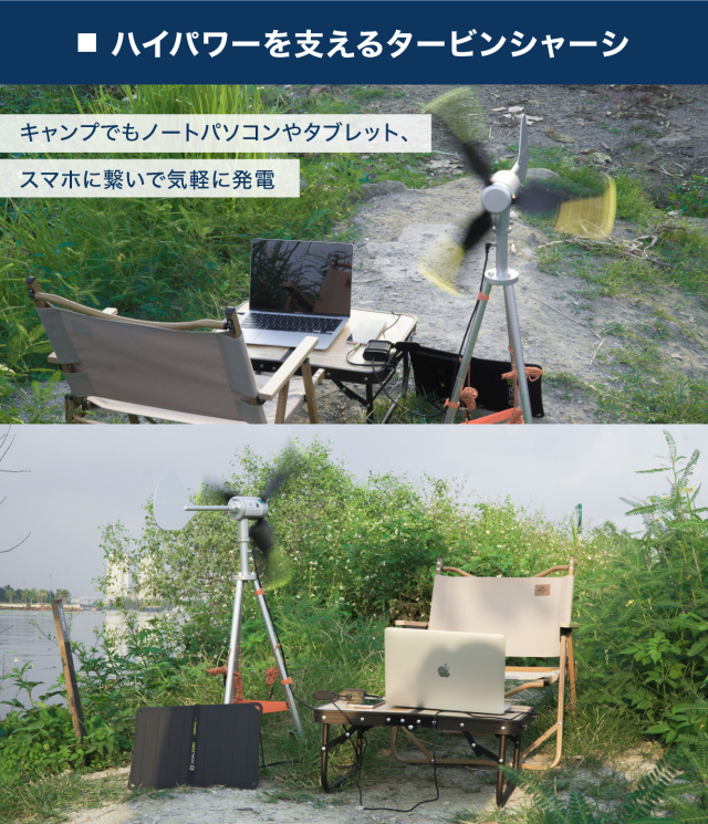 パワフルな12V風力発電機で、スマホはもちろんノートパソコンまで充電が可能です。