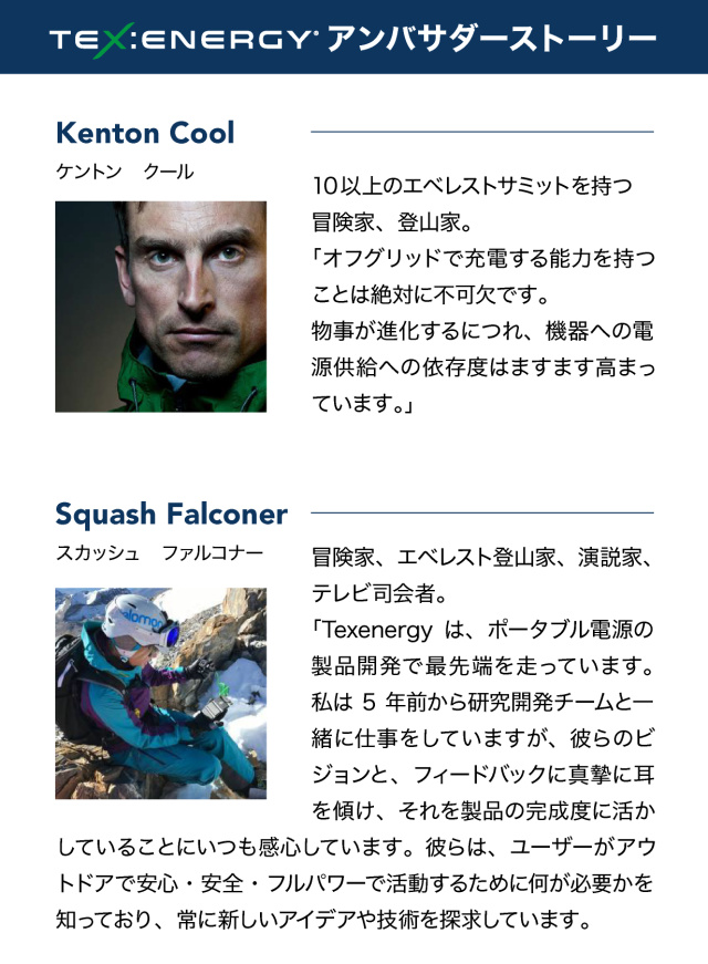 TEXENERGYの製品は世界の医療従事者、研究者や探検家、写真家や冒険家、そしてあらゆる分野のビジネスやレジャーのユーザーから信頼され、使用されています。