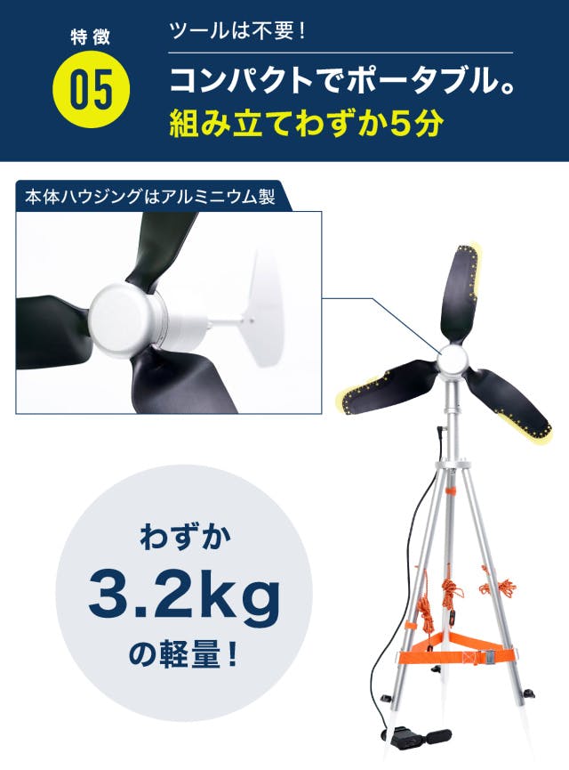 大きくて頑丈な三脚で、数分で簡単に組み立てられ、過酷な条件にも耐えることができます。