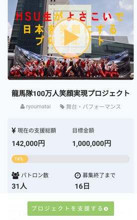 2018/01/24 15:30 只今の現状です。 クラウドファンディングを通じてこのプロジェクトに支援してくださった方々、本当に感謝しております。ありがとうございます。 皆様のお力添えのおかげもありまして、只今目標に対して14%(140000万)の達成率です。 しかし、まだまだ私たちのプロジェクト実現には多くの皆様のお力添えが必要です。 私たちは決して自分たちの利益のために活動をしているのではありません。 このプロジェクトを通して一人でも多くの人を笑顔にしたい・元気づけたい・勇気づけたい この一心です!!! しかし、我々学生ができることにも限度があり、今回、プロジェクトをクラウドファンディングという手法を通じて皆様にお伝えさせていただいております。 募集終了まで、あと16日!(2018年1月24日時点) どうか、このプロジェクトに賛同してくださる方がいらっしゃいましたらご家族・ご友人・身内の方々にも広めていただきたいです。 そうすることで支援の輪が広がっていきます。 我々も残りの期間、これまでの活動を定期的に載せるなどして活動報告を充実させたり、SNS(Twitter、Facebook中心)での情報発信による呼びかけを行い、最大限の努力をして参ります。 何卒、宜しくお願い致します。 龍馬隊 副代表 村山 もっと見る
