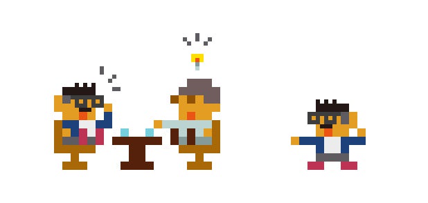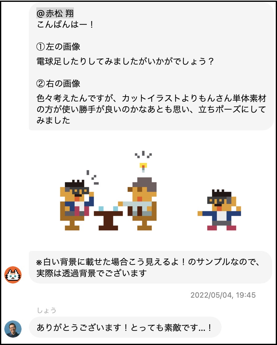 もんざえもんさん「コーチングをやってるので、コーチングのドット絵が欲しい。二人で話している感じ。男性、中間管理職の方へのコーチングが多い」