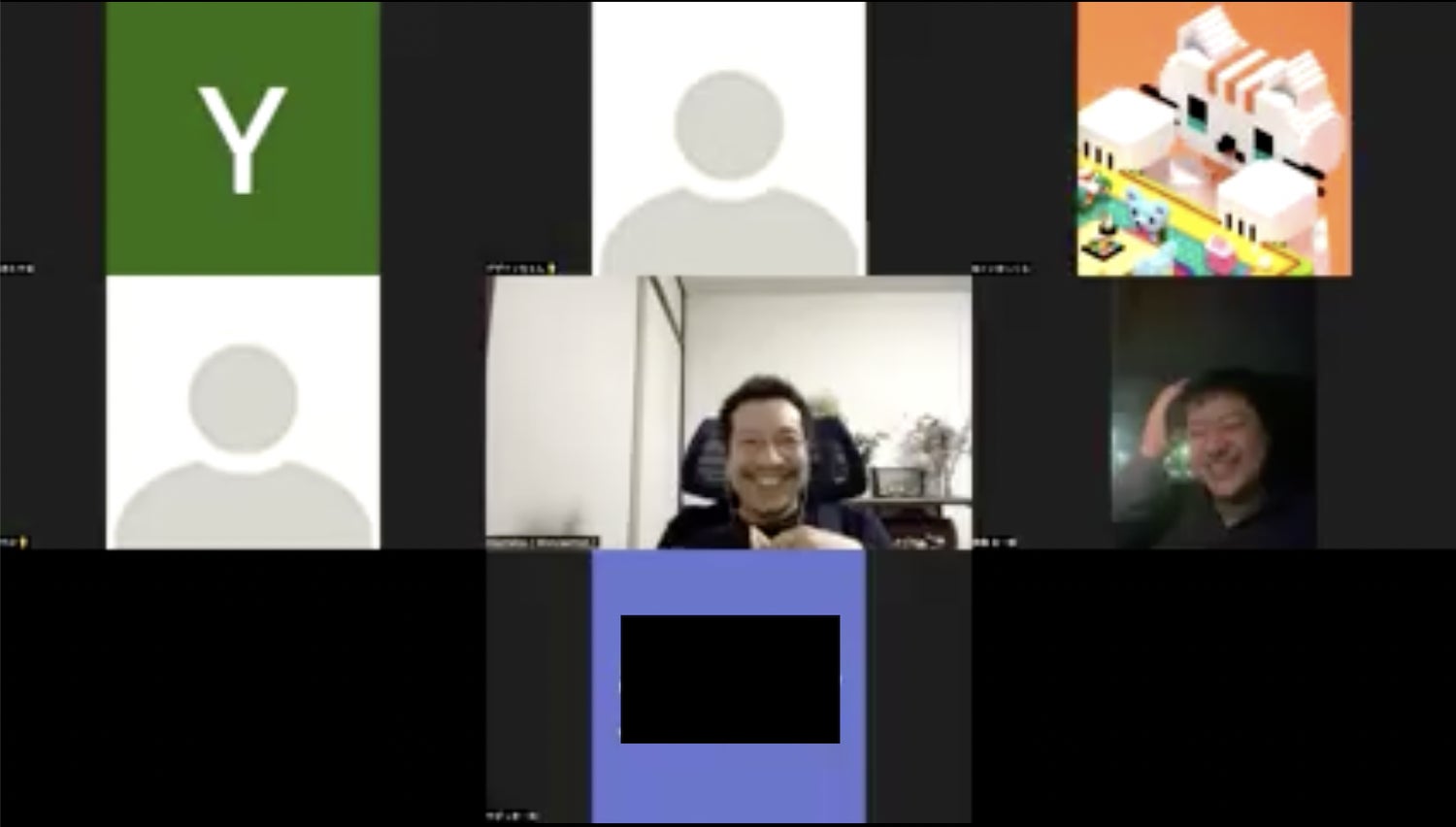 (ヒアリングの様子。終始笑いが絶えない楽しいヒアリングでした。画面中央がもんざえもんさん、画面右側上から2番目がケイイチさん。二人とも笑顔が素敵です)