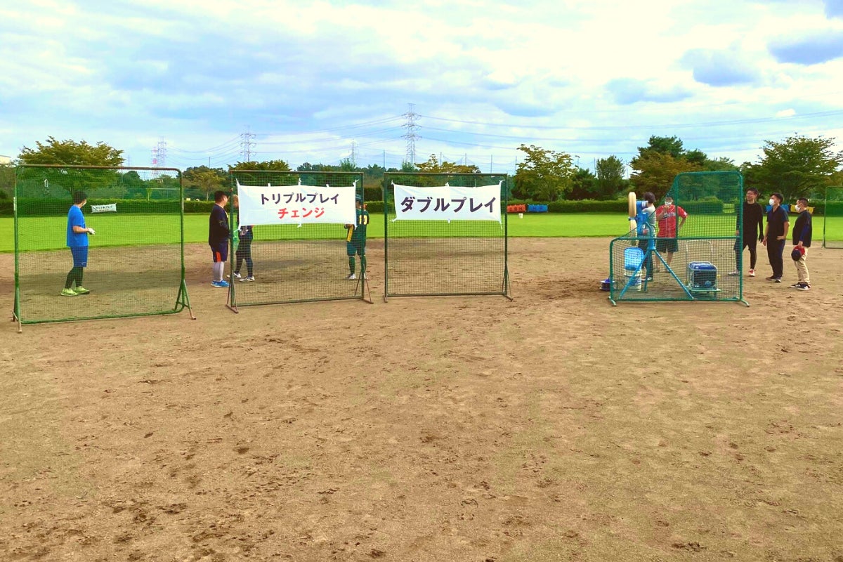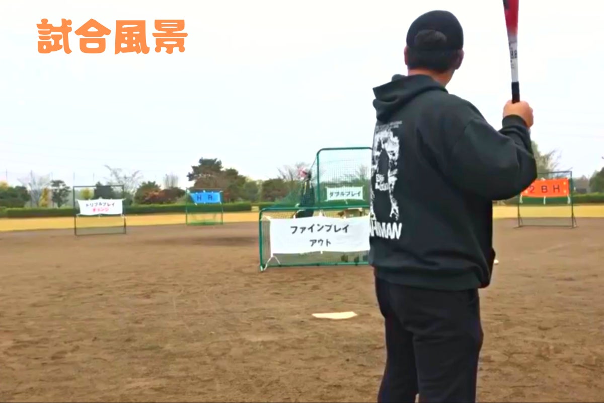 野球場に設置したピッチングマシン(投球マシン)から、出てくる野球ボールを打つだけ。その打球の飛んだ先でヒット、アウト、ホームランなどが決まります。打った後、塁に向かって走ることも、攻守交替して守備をすることもありません。打球の行き先のみで勝敗が決まるシンプルなゲームです。そして、試合成績はデータ共有するのでゲーム性も高く、チームの勝敗とともに個人成績が数値化されHR王やMVPなどの選出も可能です。